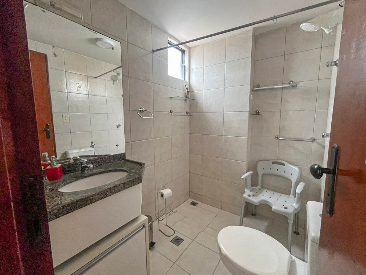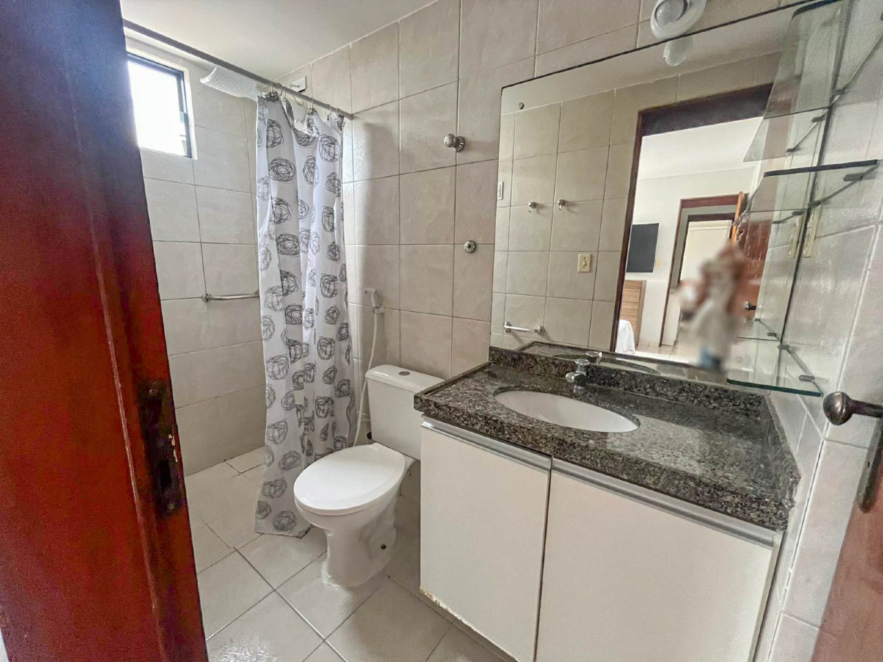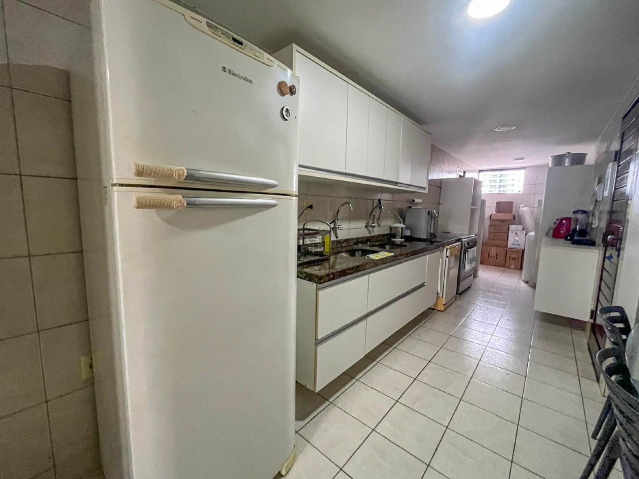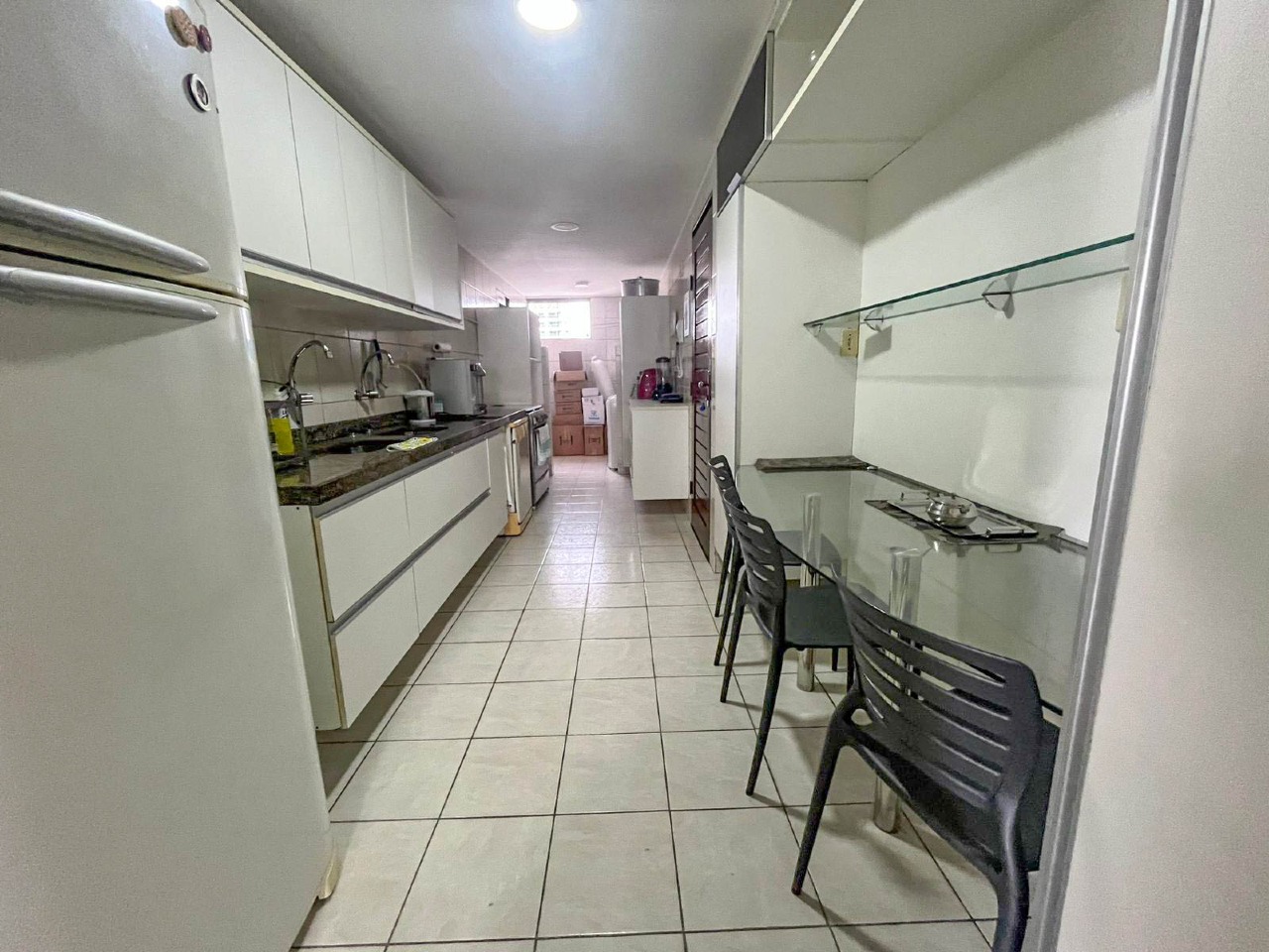 Apartamento mobiliado com sala ampla para dois ambientes, cozinha com área de serviço integrada, três quartos, quatro banheiros sendo dois deles suítes.
