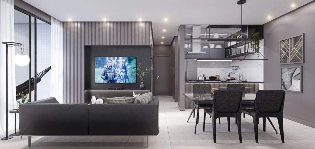 Apartamentos com 59m², possuindo 2 quartos, sendo um suíte, sala, varanda gourmet, cozinha com área de serviço integrada, banheiro social, e uma vaga de garagem.