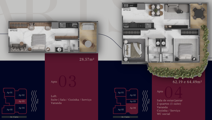 Com opções de plantas diferentes, sendo; Apartamentos com 28,57m² possuindo um quarto, banheiro social, sala de estar/jantar e cozinha com área de serviço integrada e varanda.