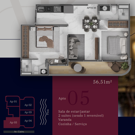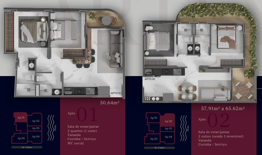 Apartamentos com 50,64m² a 65,62m² possuindo dois quartos sendo um suíte, sala de estar/jantar, banheiro social, cozinha com área de serviço integrada e varanda.
