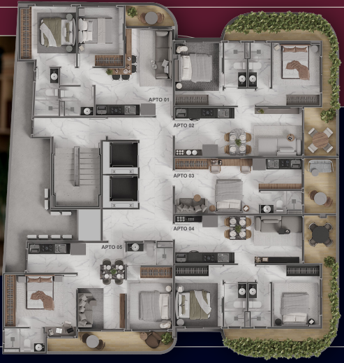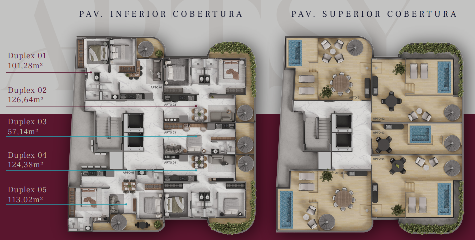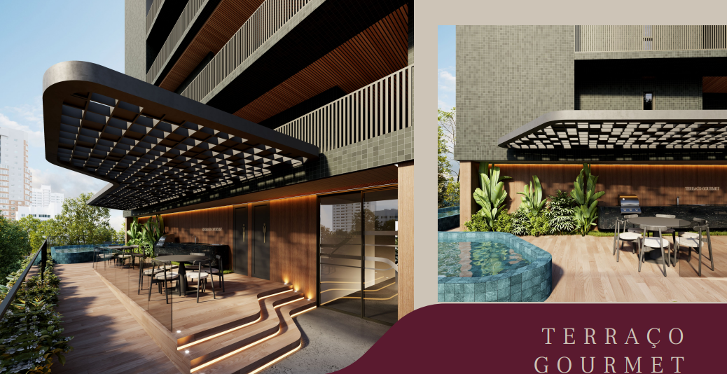 Coberturas com 99,27m² a 124,63m² possuindo dois quartos, banheiro social, sala de estar/jantar, cozinha com área de serviço integrada e terraço com área gourmet privativa.