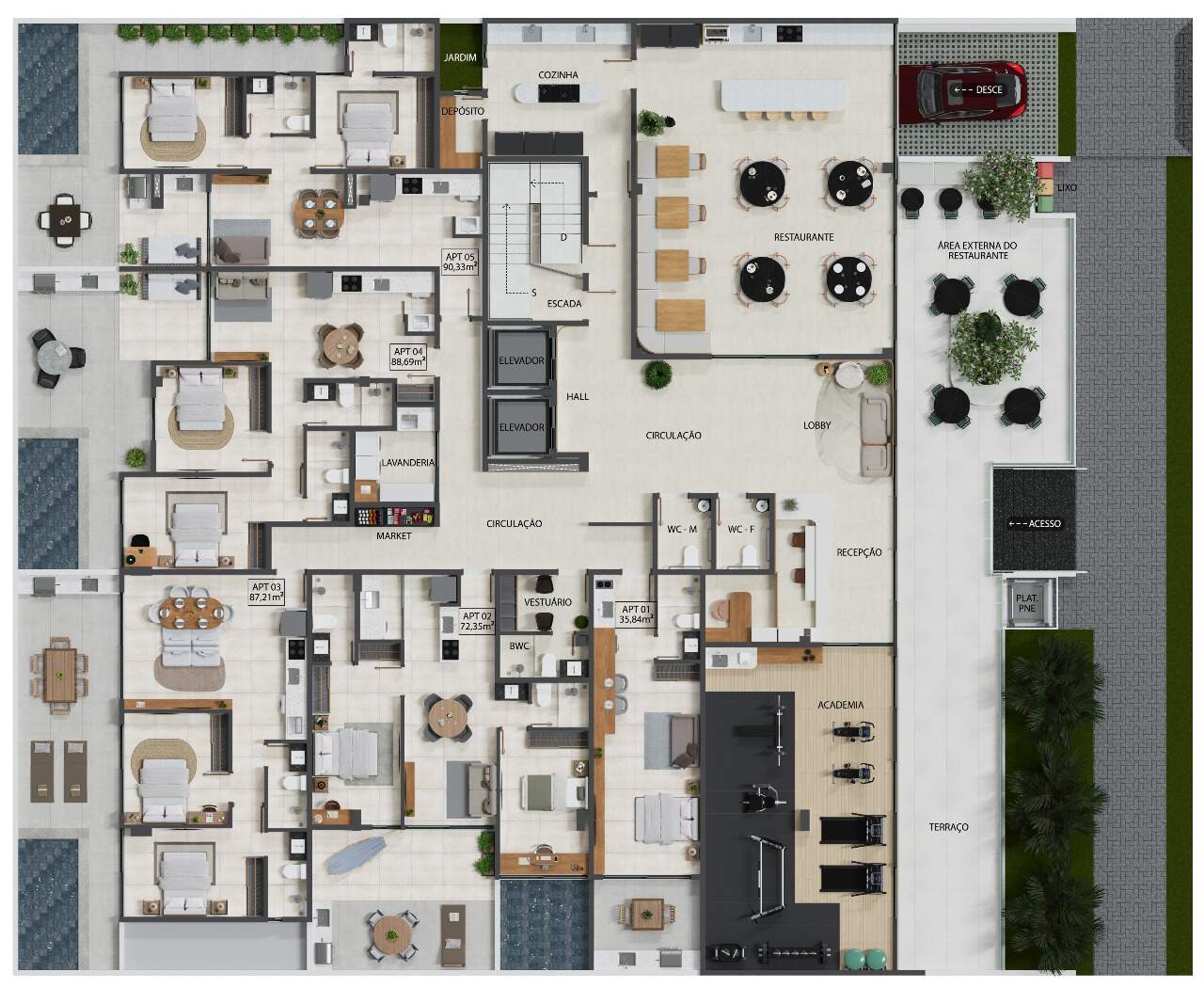 Com opções de plantas diferentes, sendo; Apartamentos Garden com 86m² a 88m² possuindo dois quartos sendo uma suíte, banheiro social, sala de estar/jantar, cozinha com área de serviço integrada e área externa privativa;