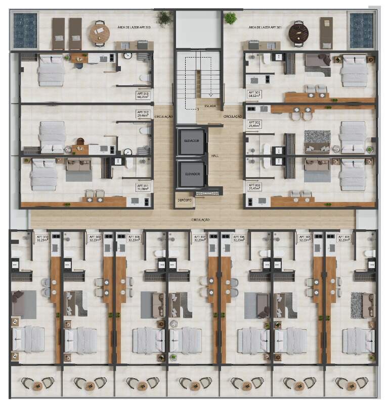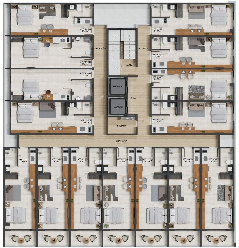 Flats com 25m² a 40m² possuindo um banheiro social e cozinha de apoio, alguns com varanda;