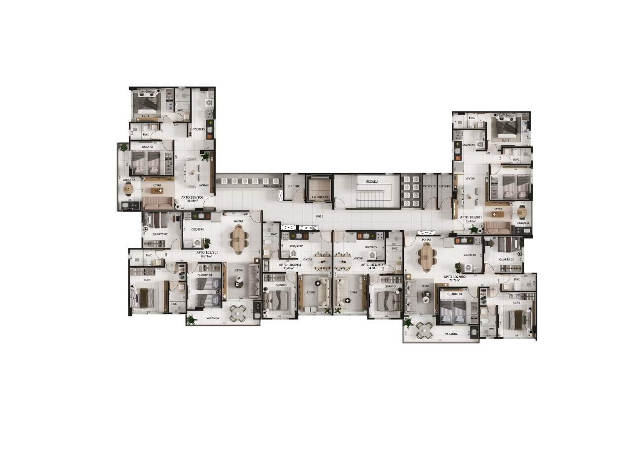Apartamento com 77,72m² a 80,71m², possuindo uma sala de estar/jantar, cozinha com área de serviço integrada, três quartos, sendo uma suíte; banheiro social e uma varanda.