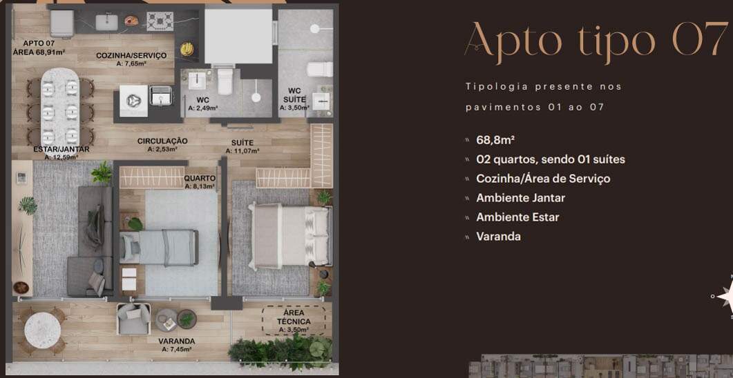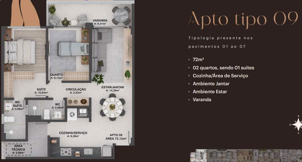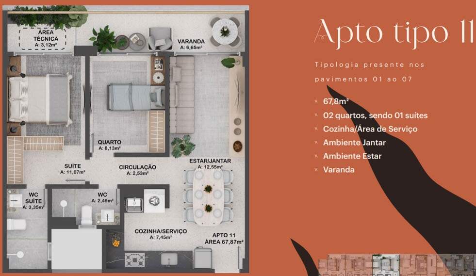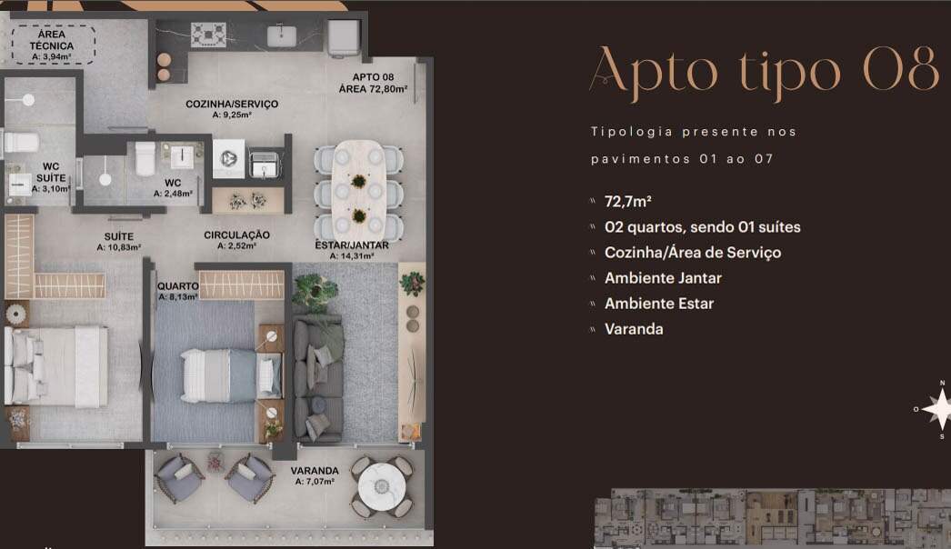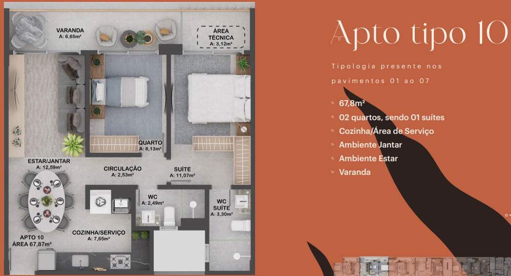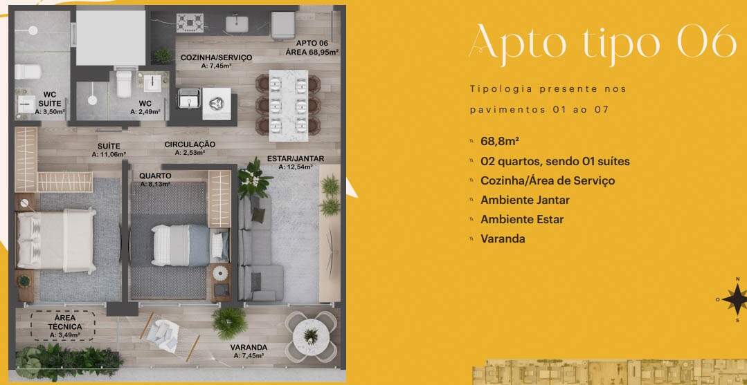Apartamentos com 67m² a 72m² possuindo dois quartos sendo 1 suíte com closet, sala de estar com varanda, sala de jantar, banheiro social, cozinha e área de serviço.
