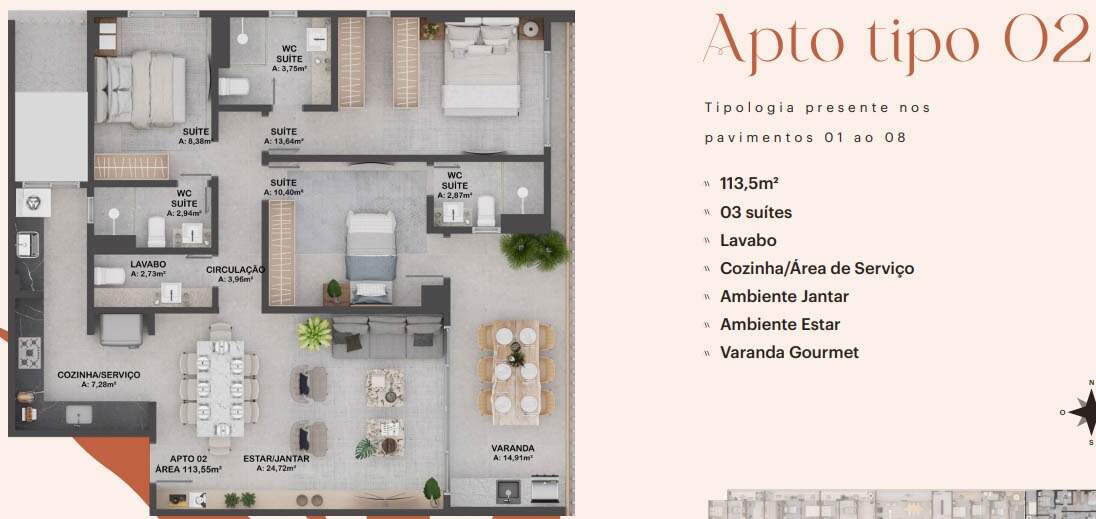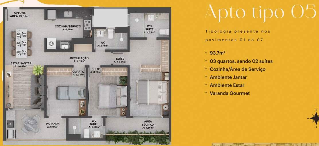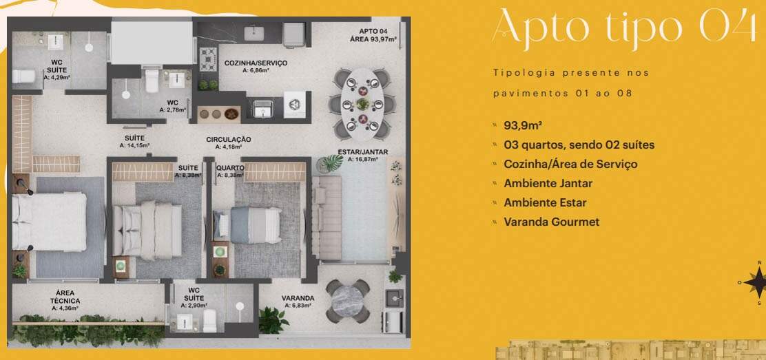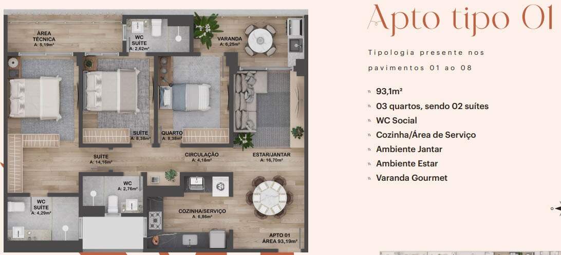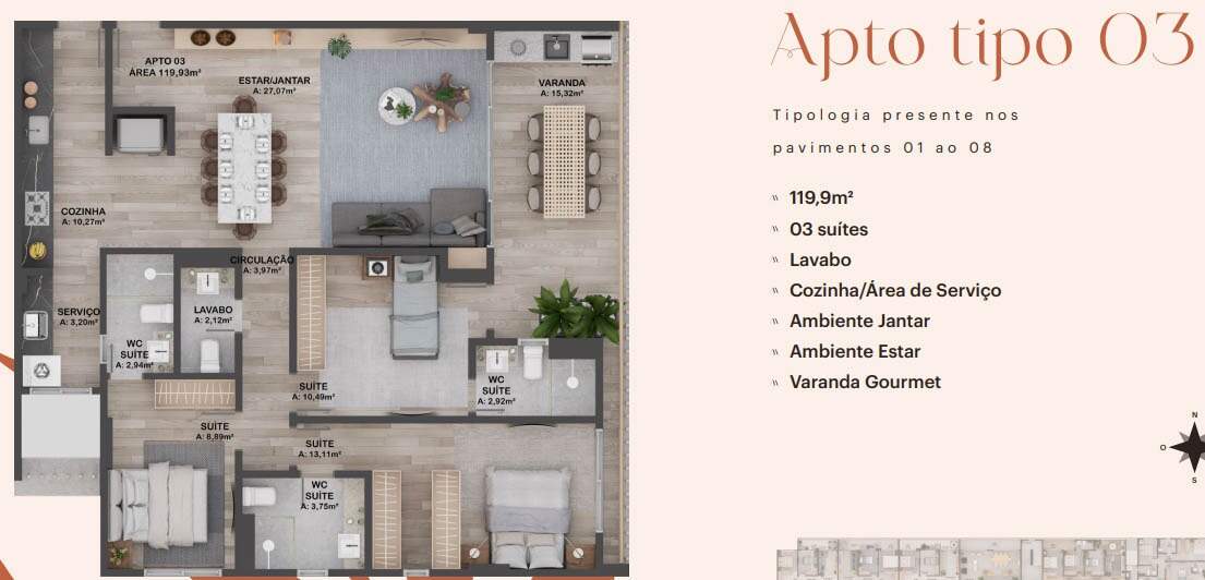 Apartamentos com 93m² a 119m² possuindo três quartos sendo duas suítes e uma com varanda, banheiro social, sala de estar com varanda, sala de jantar, cozinha e área de serviço.