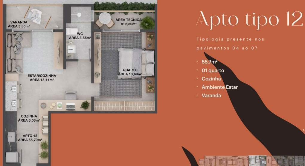 Apartamentos com 55m² possuindo 1 quarto com varanda, banheiro social, cozinha e sala com varanda.