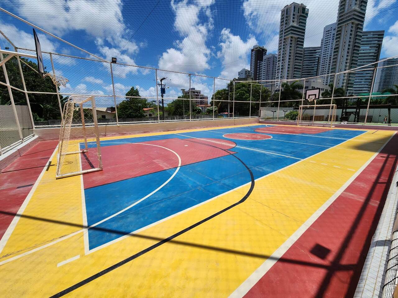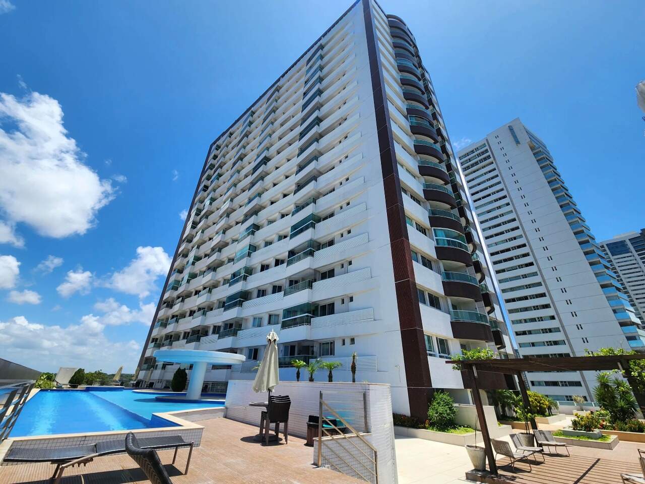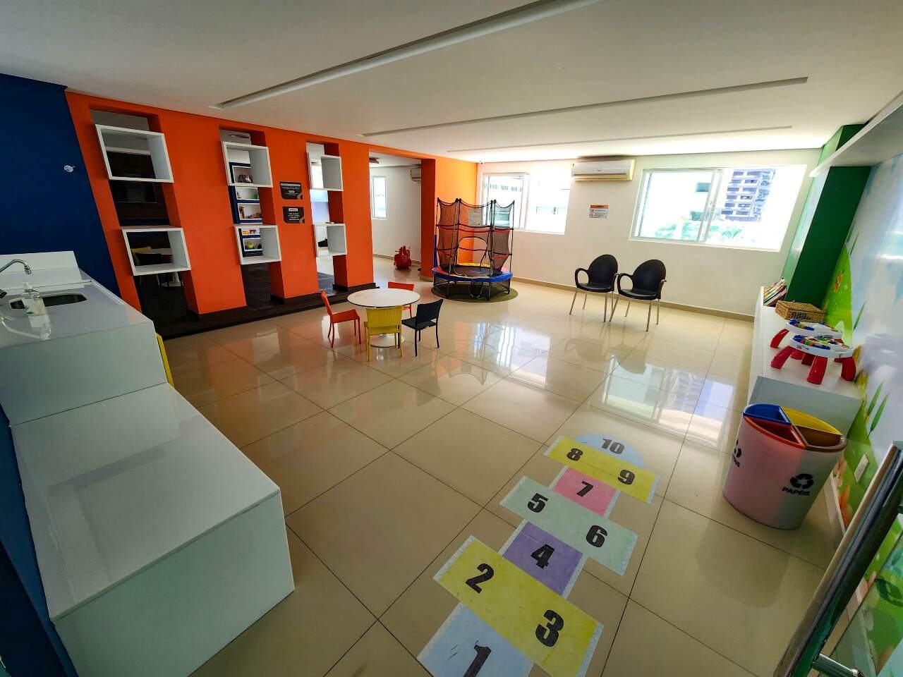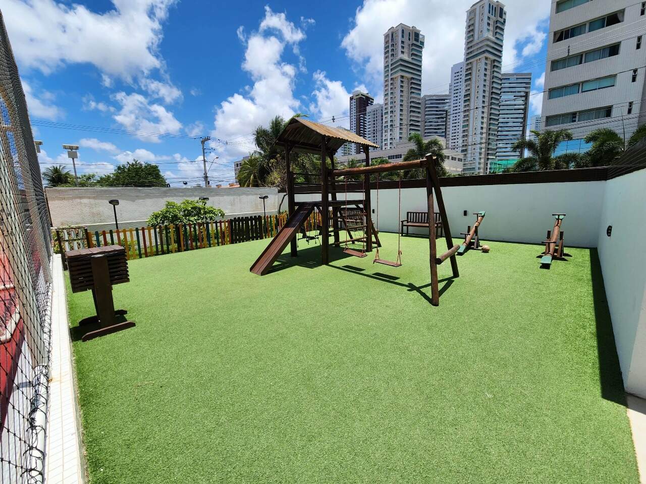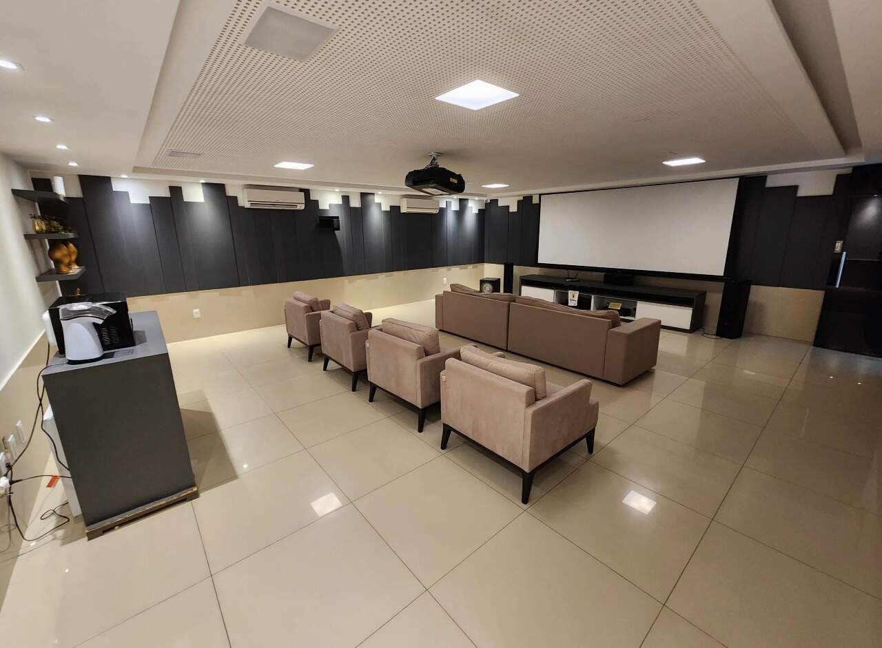 > Prédio com piscina, churrasqueira, playground, salão de festas, cinema, salão de beleza, jardim, quadra poliesportiva e academia;