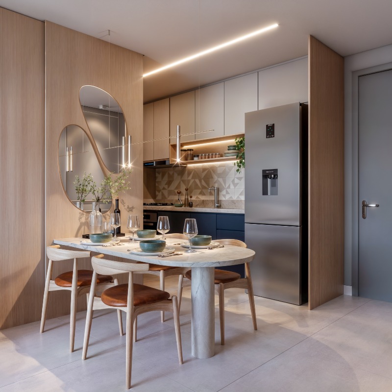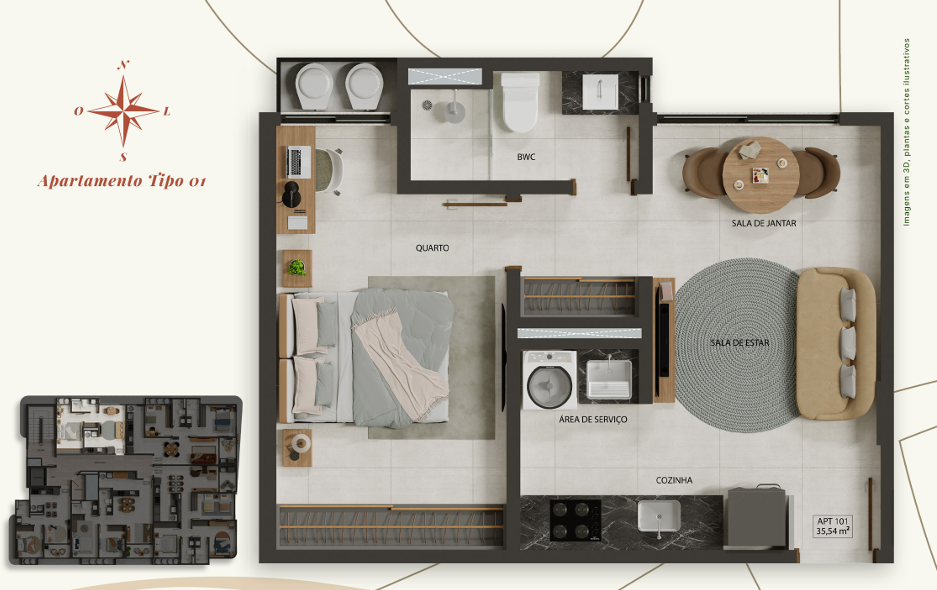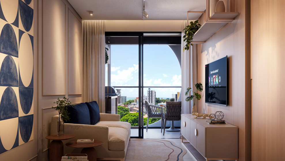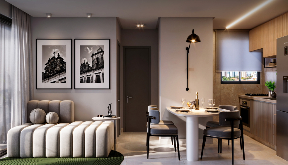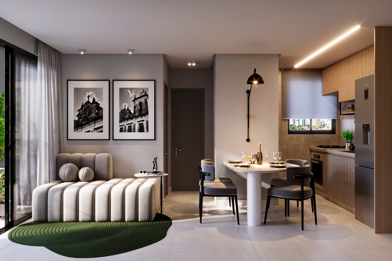 Apartamento com 35,54m² a 74,20m² possuindo opções com varanda, unidades com 1, 2 ou 3 quartos, sala ampla para dois ambientes, cozinha integrada com a área de serviço, algumas unidades com suítes e banheiro social.