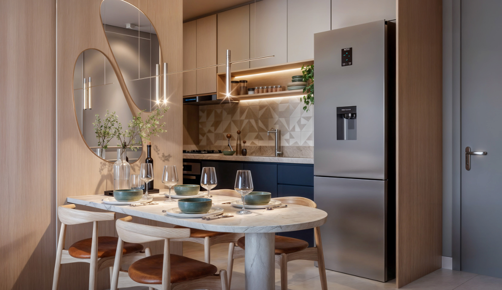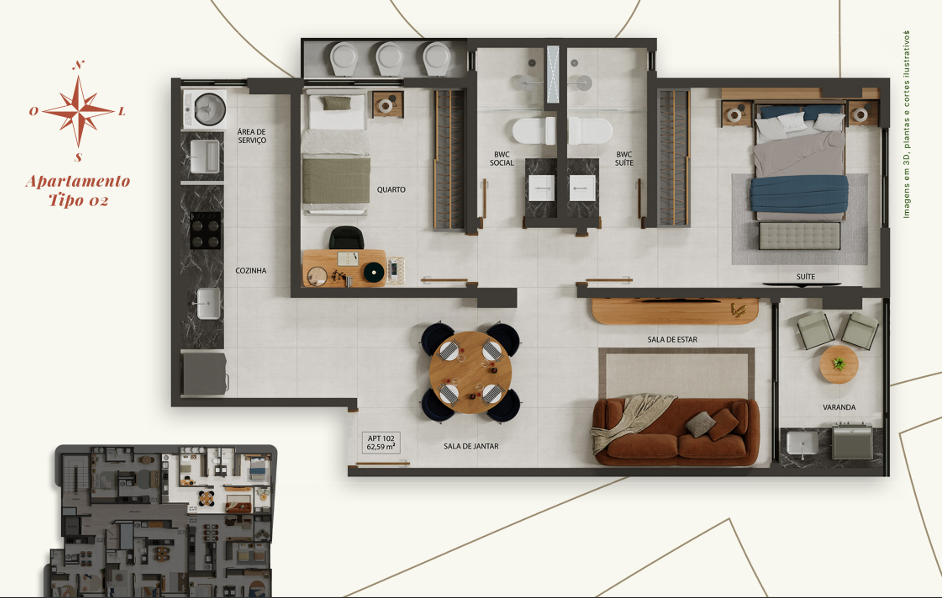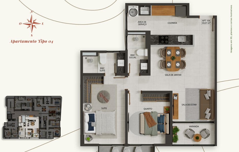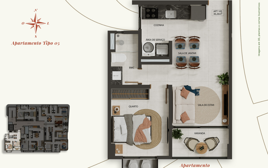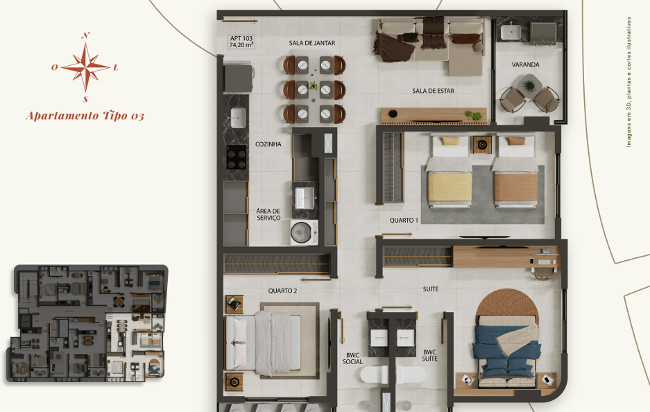 Apartamento com 35,54m² a 74,20m² possuindo opções com varanda, unidades com 1, 2 ou 3 quartos, sala ampla para dois ambientes, cozinha integrada com a área de serviço, algumas unidades com suítes e banheiro social.