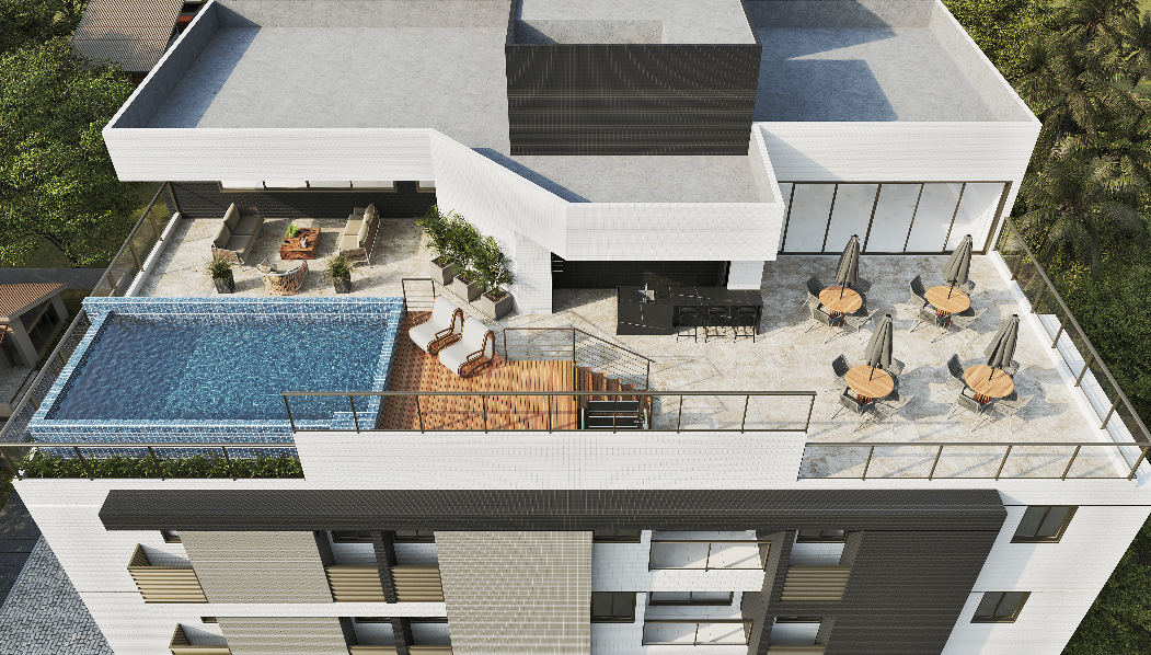 > Área de lazer com piscina, churrasqueira e espaço gourmet;