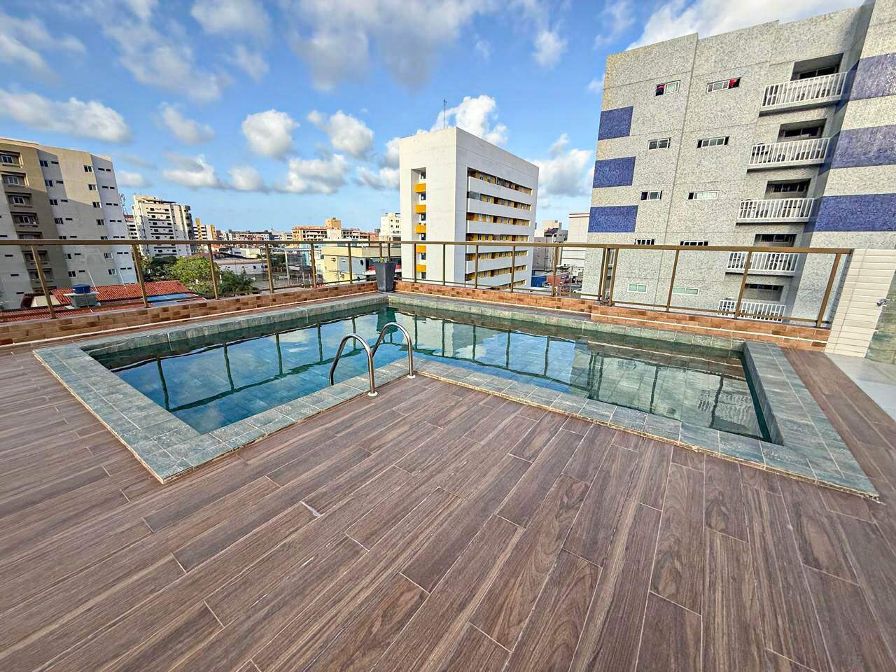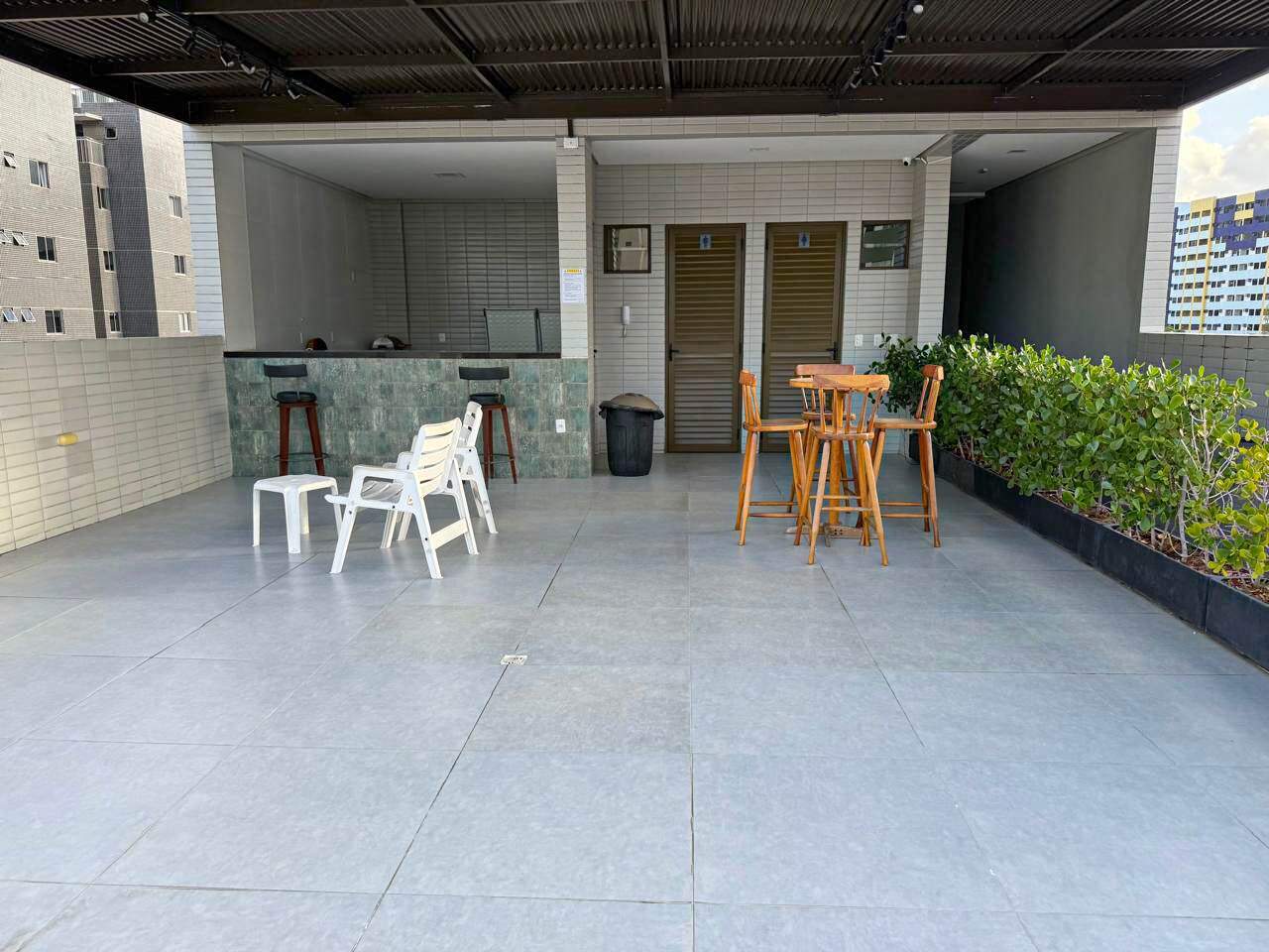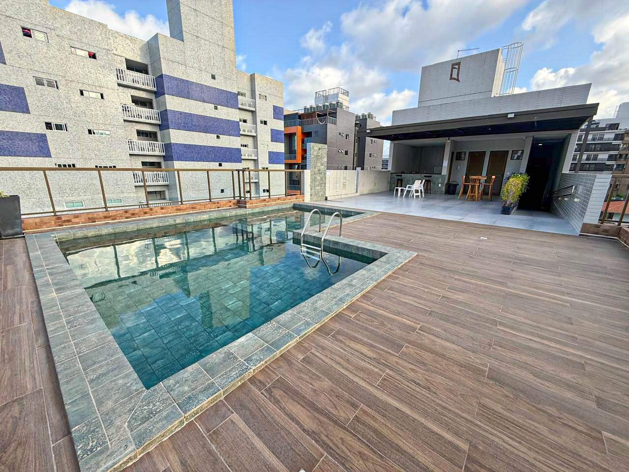 > Área de lazer com piscina e churrasqueira;