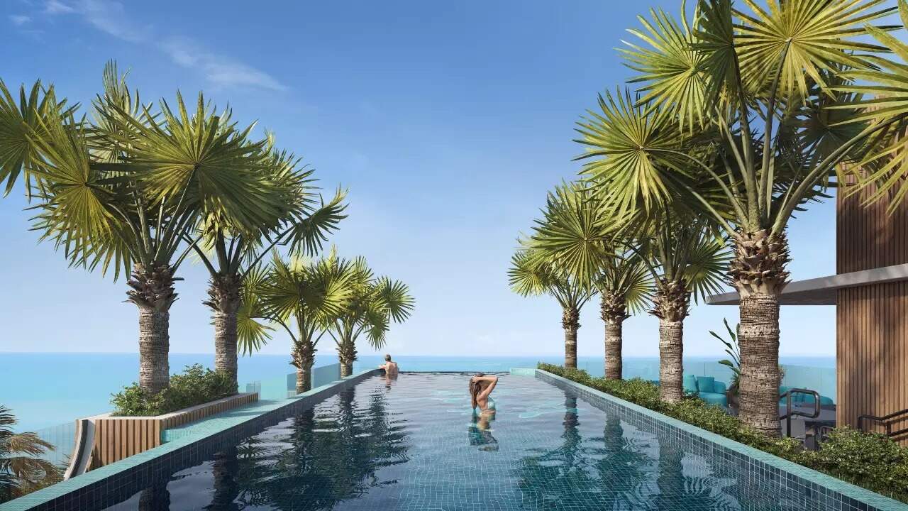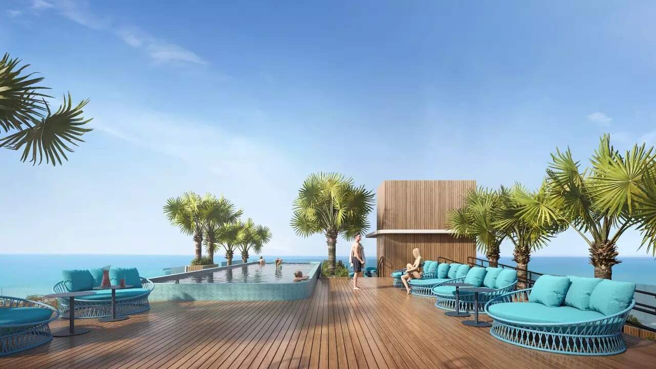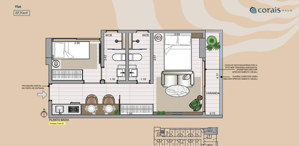 Apartamento com sala para dois ambientes, varanda aconchegante com vista para o mar, cozinha de apoio, um quarto independente sendo suíte e um banheiro social.