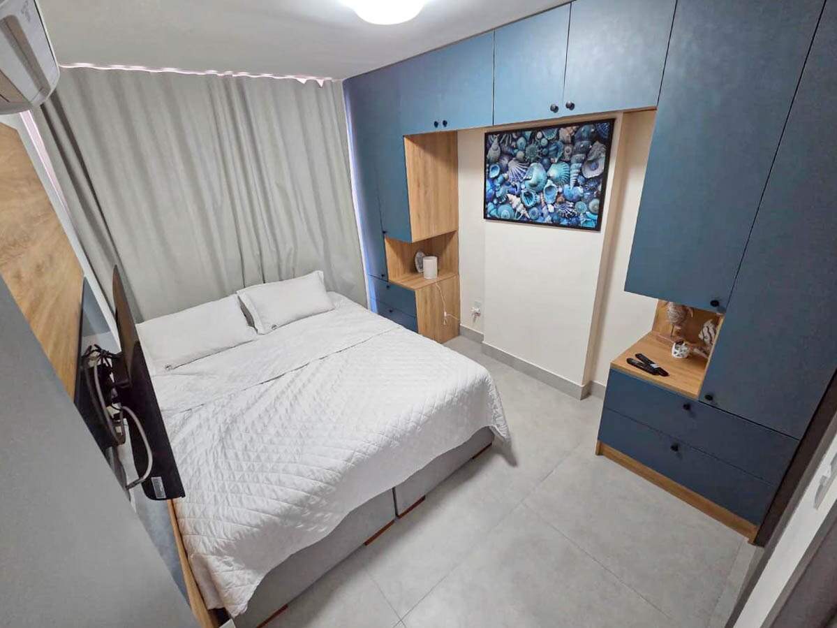 Apartamento com sala ampla para dois ambientes, cozinha de apoio equipada com móveis planejados, um quarto e banheiro social. Conforto e praticidade no dia a dia.
