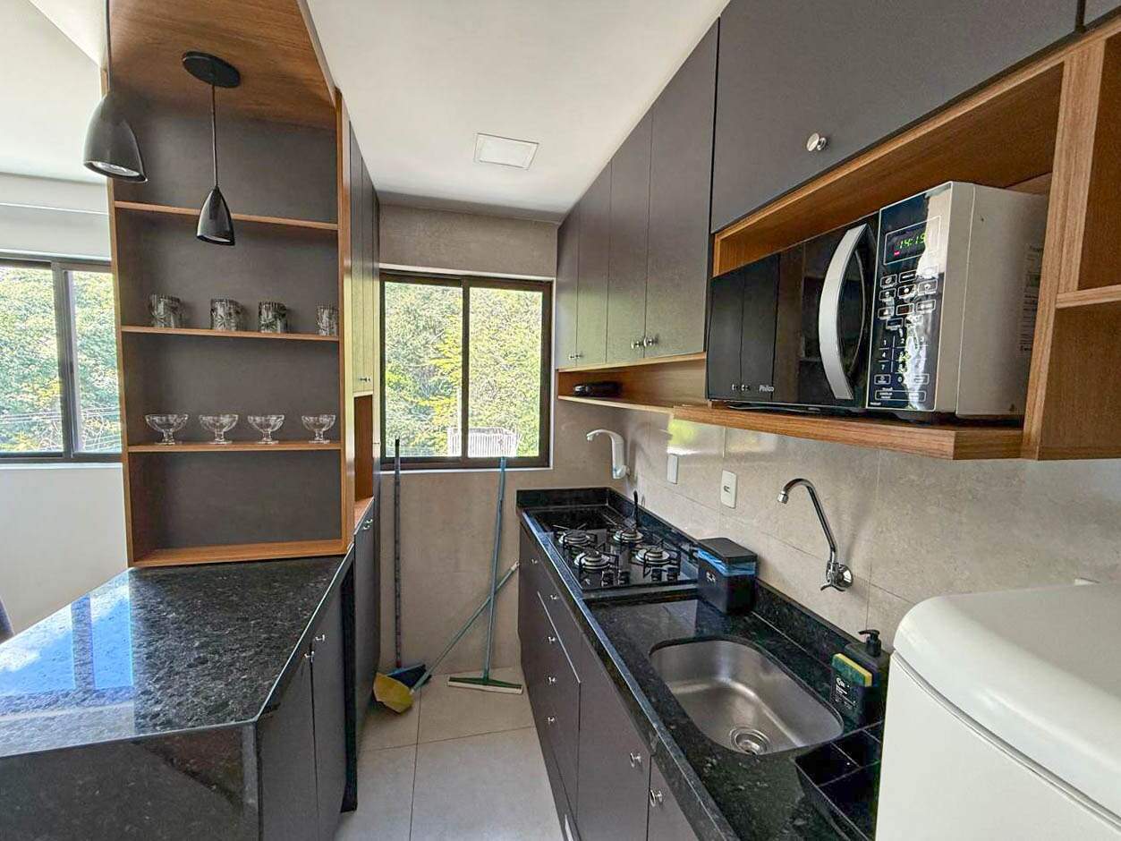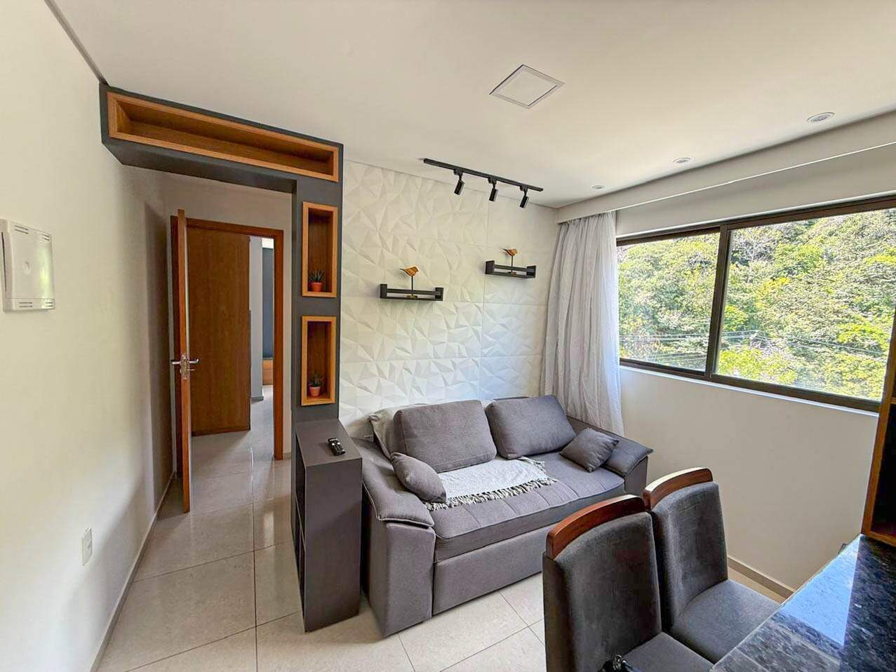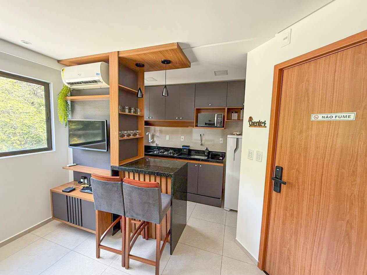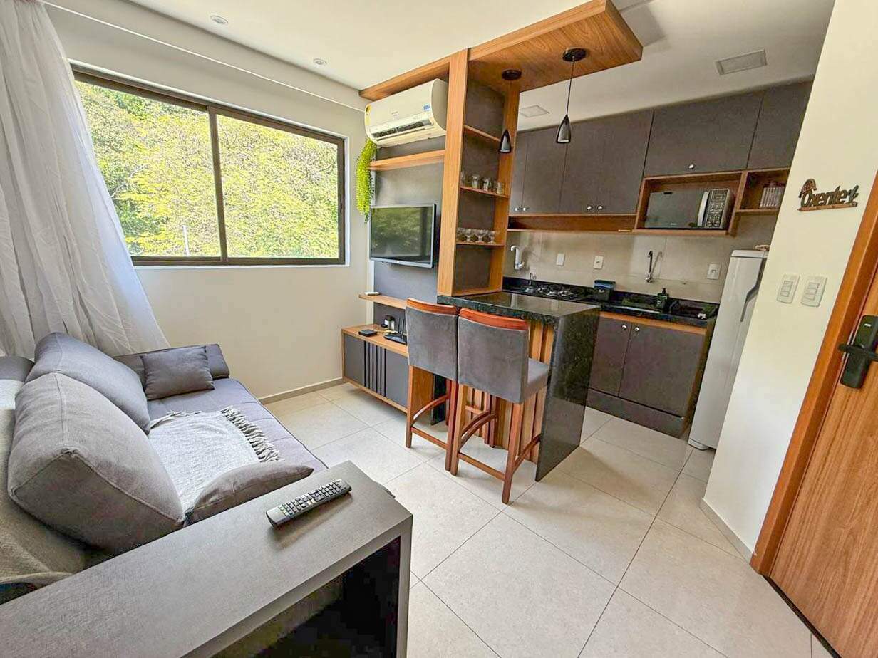 Apartamento com sala acolhedora, cozinha de apoio prática com móveis projetados, quarto confortável e um banheiro social — um espaço funcional, moderno e ideal para o dia a dia.