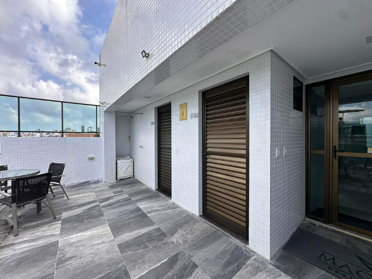 > Área de lazer com piscina e churrasqueira;