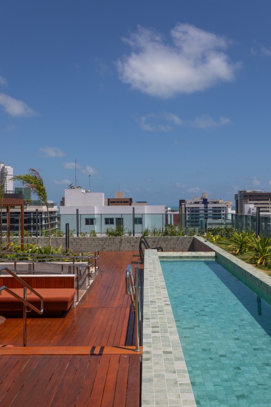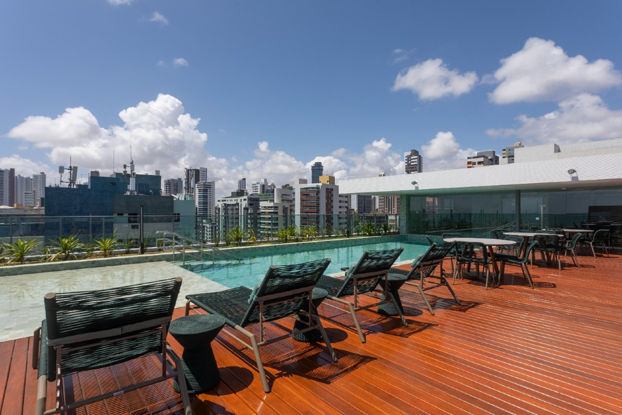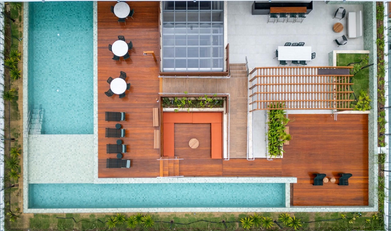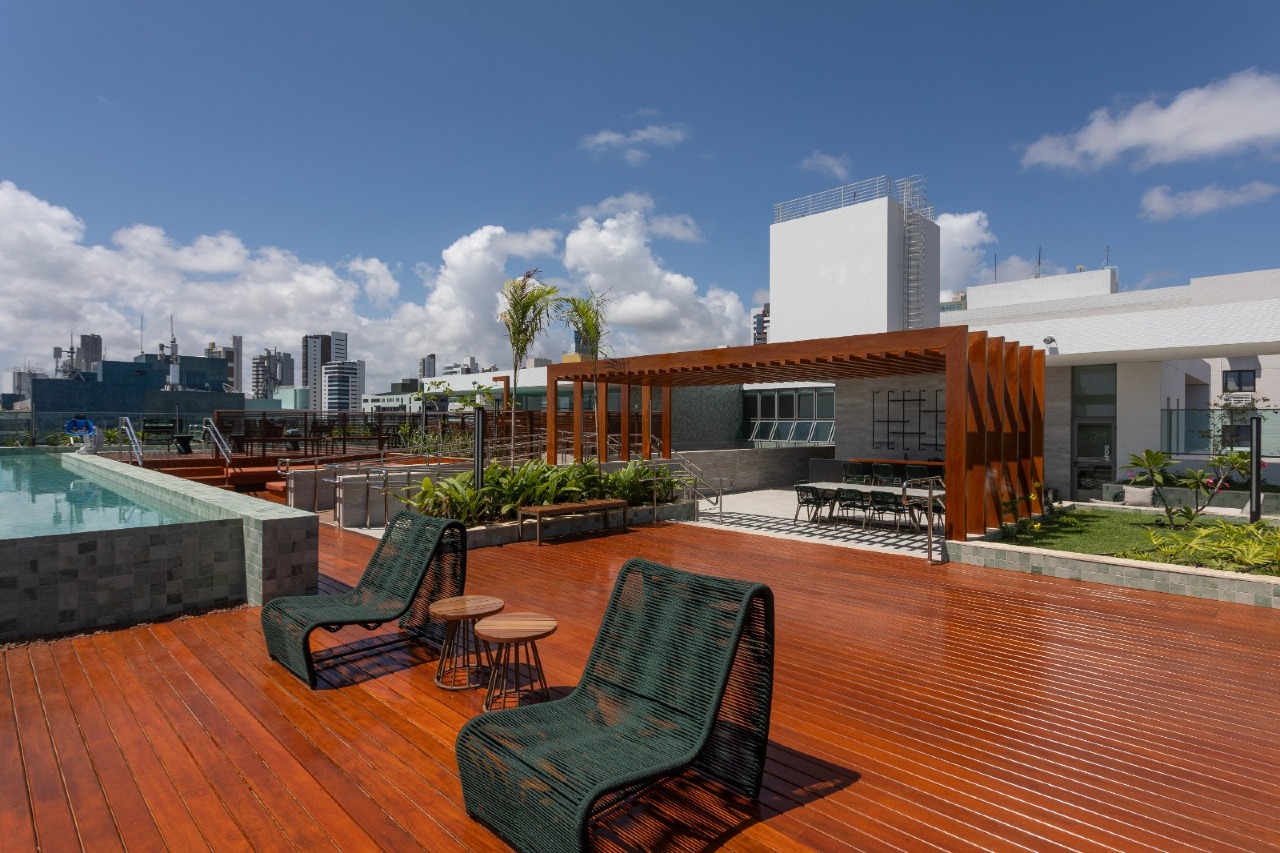 > Área de lazer com piscina e churrasqueira;