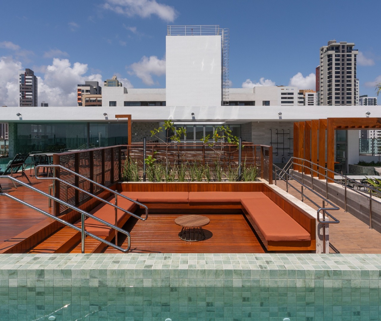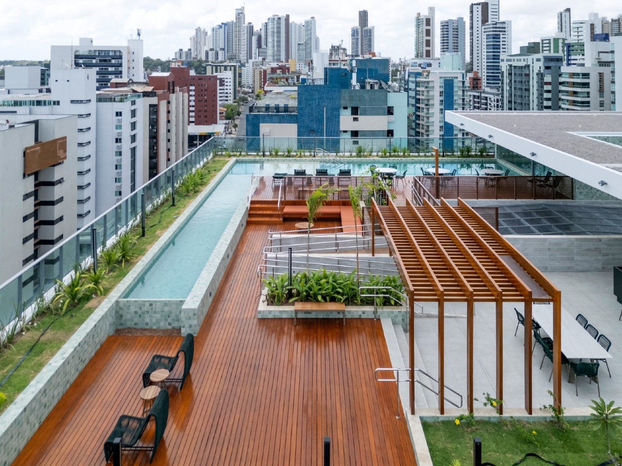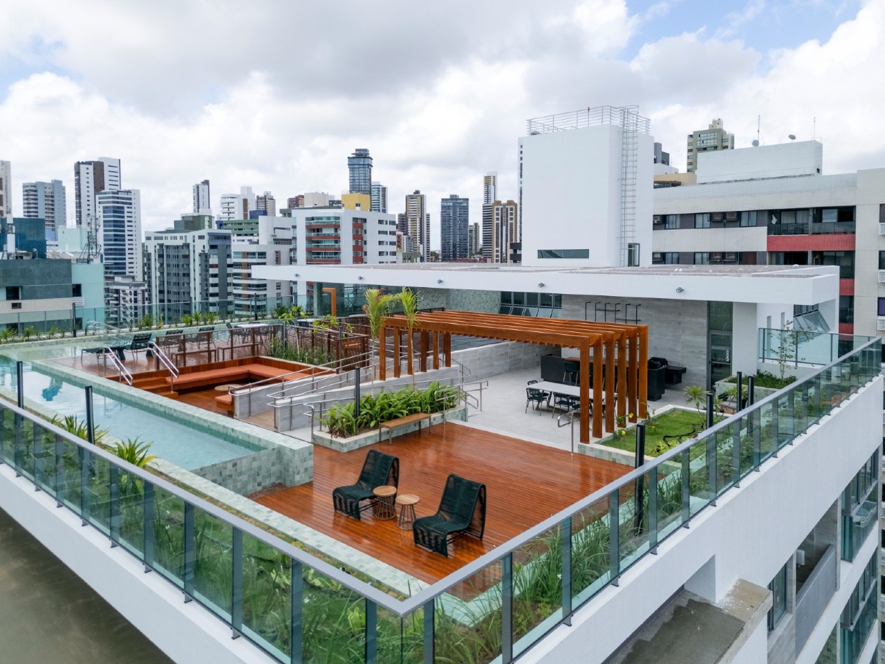 > Área de lazer com piscina e churrasqueira;