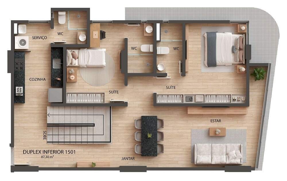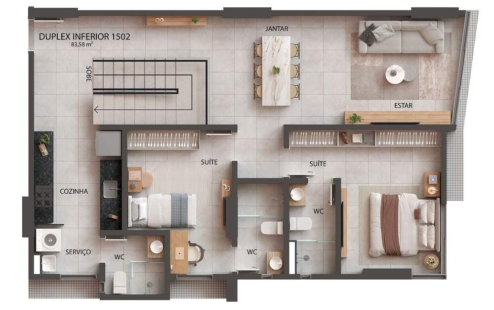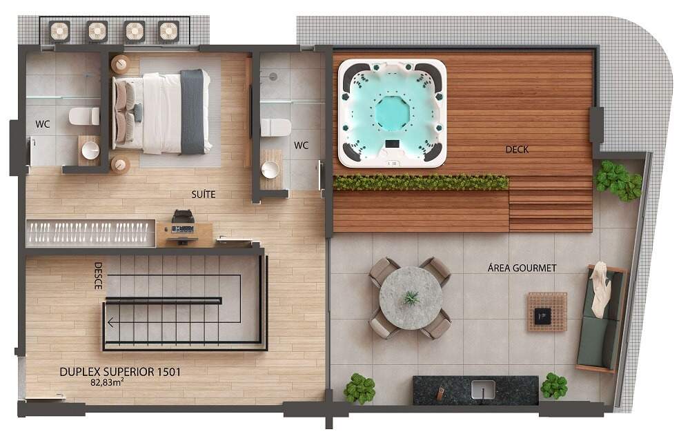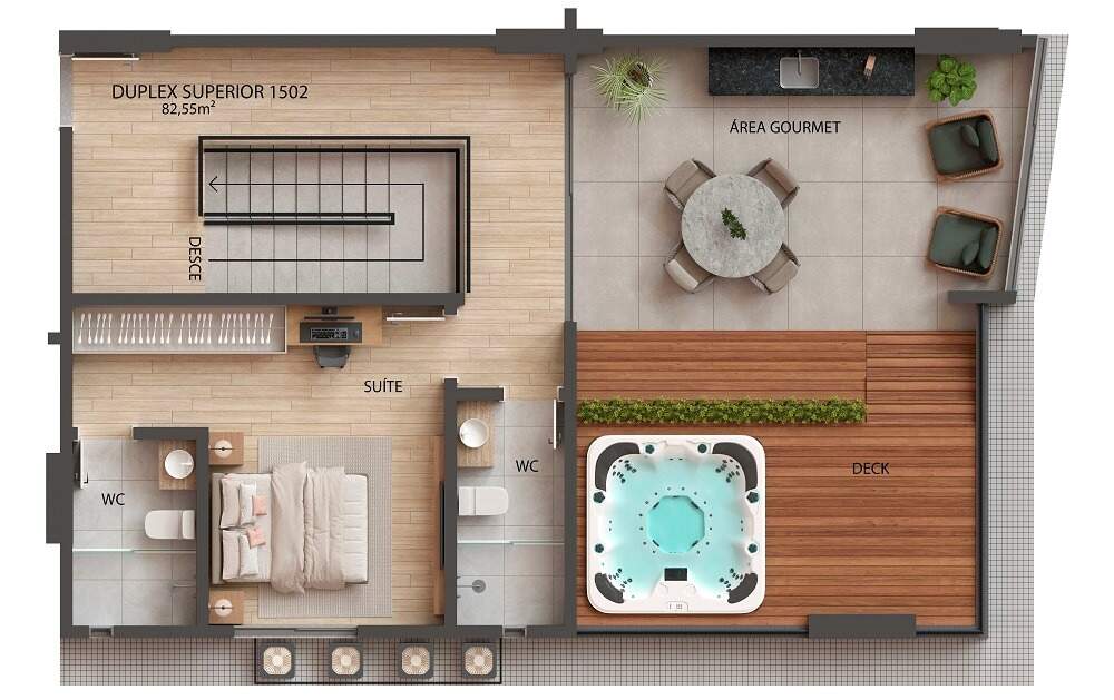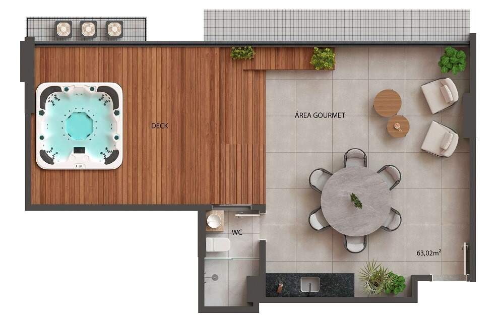 Coberturas com 128,18m² a 167m² possuindo de dois a três quartos, sendo uma a três suítes, banheiro social, sala de estar/jantar, cozinha com área de serviço integrada e terraço gourmet com jacuzzi.