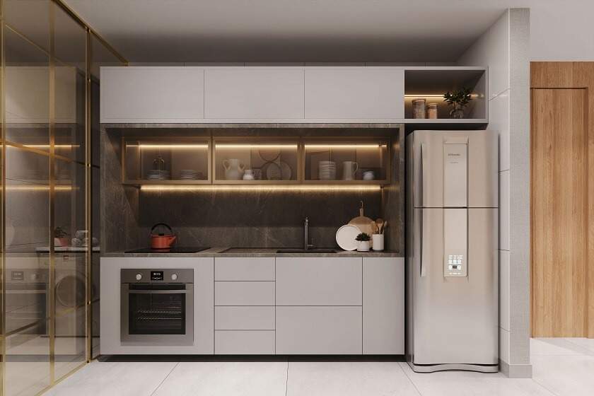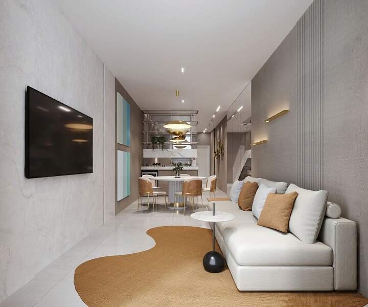 Apartamentos com 79,44m² possuindo três quartos sendo uma suíte, banheiro social, sala de estar/jantar, cozinha com área de serviço integrada e varanda.