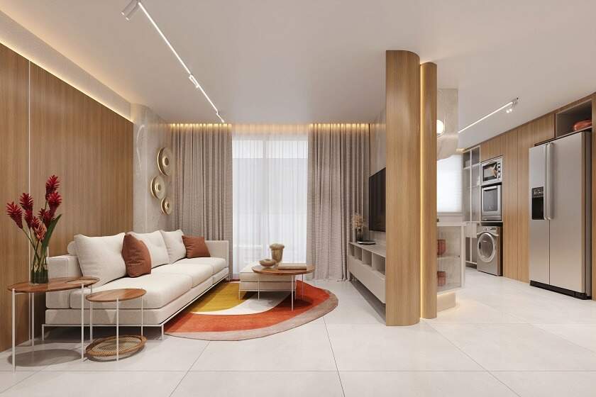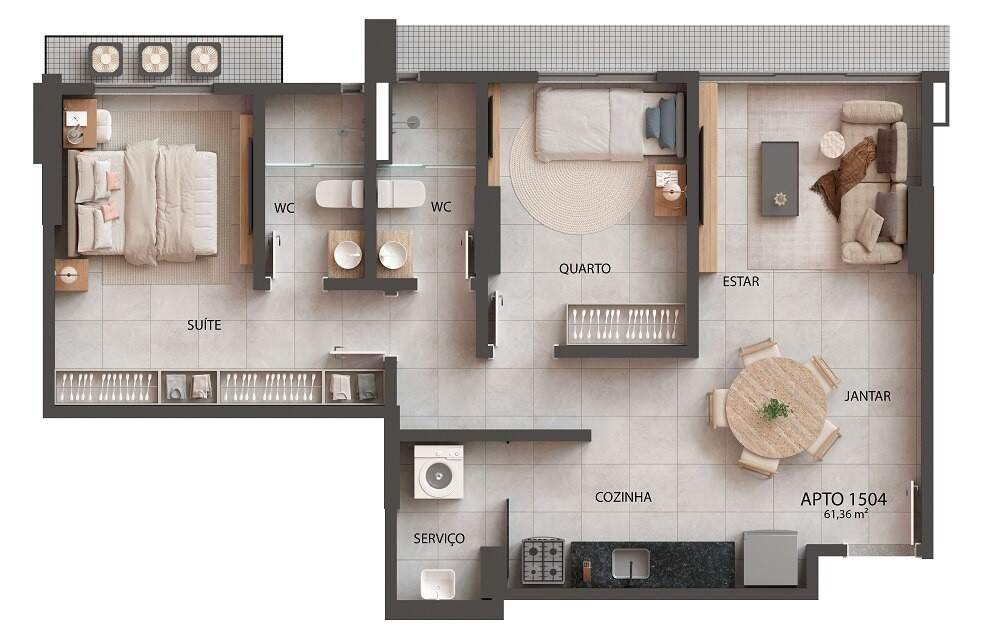 Com opções de plantas diferentes, sendo; Apartamentos com 64,59m² possuindo dois quartos sendo uma suíte, banheiro social, sala de estar/jantar, cozinha com área de serviço integrada e varanda.