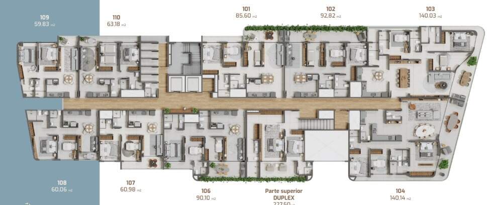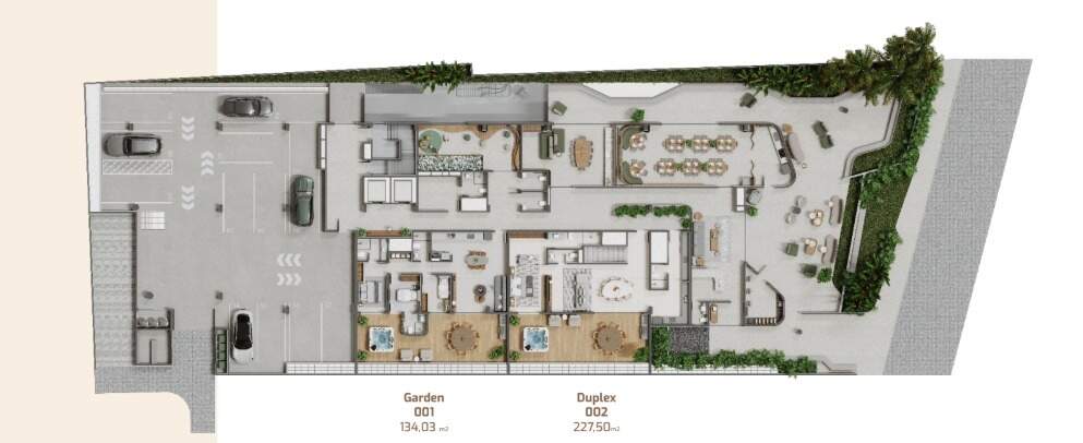 Com opções de plantas diferentes, sendo; Apartamento garden duplex com 227,50m², possuindo 3 suítes, sala de estar, jantar, lavabo, área privativa gourmet, hidromassagem, varanda e cozinha com área de serviço.