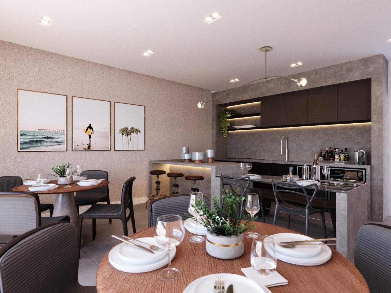 Apartamento com 66m² possuindo três quartos sendo um suíte, banheiro social, sala de estar/jantar, cozinha com área de serviço integrada e varanda.