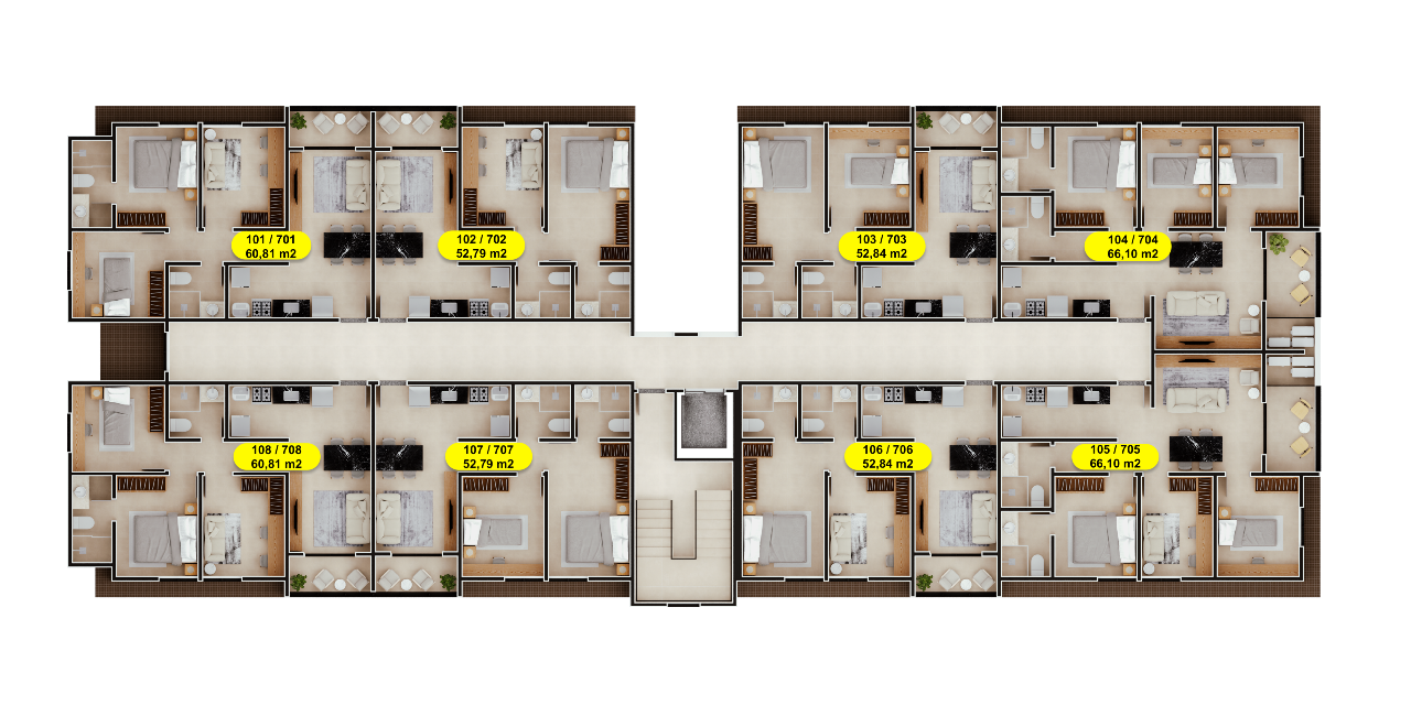 Com opções de plantas diferentes, sendo: Apartamentos com 52,79m² possuindo dois quartos sendo uma suíte, banheiro social, sala de estar/jantar e cozinha com área de serviço integrada e varanda.