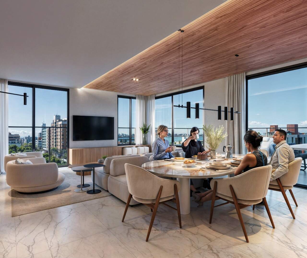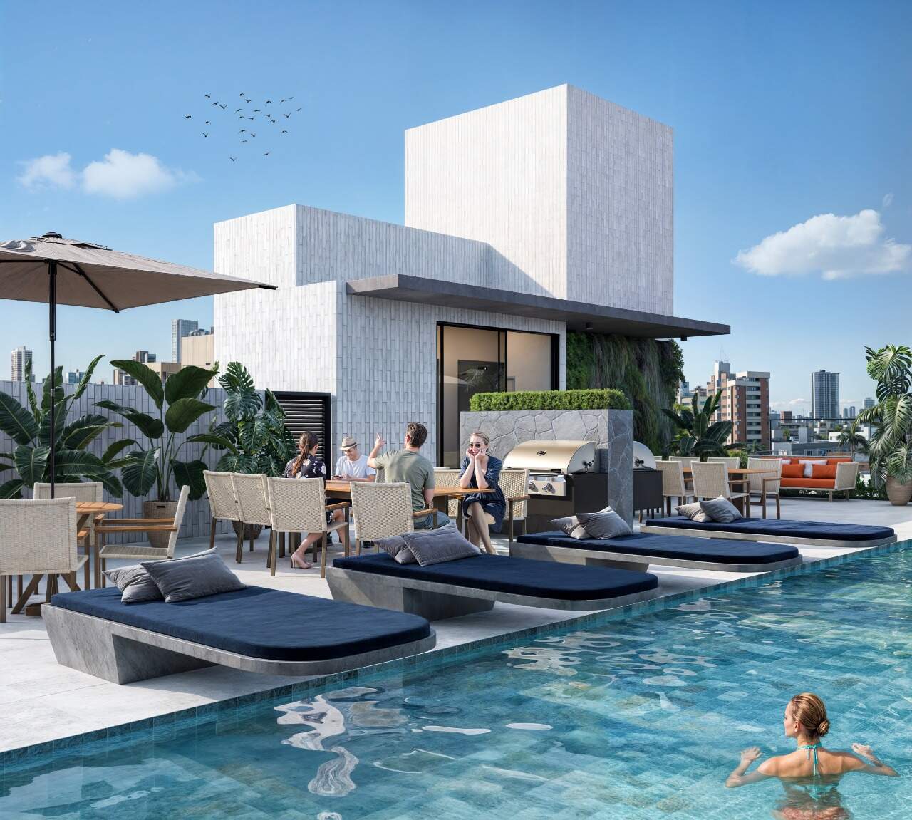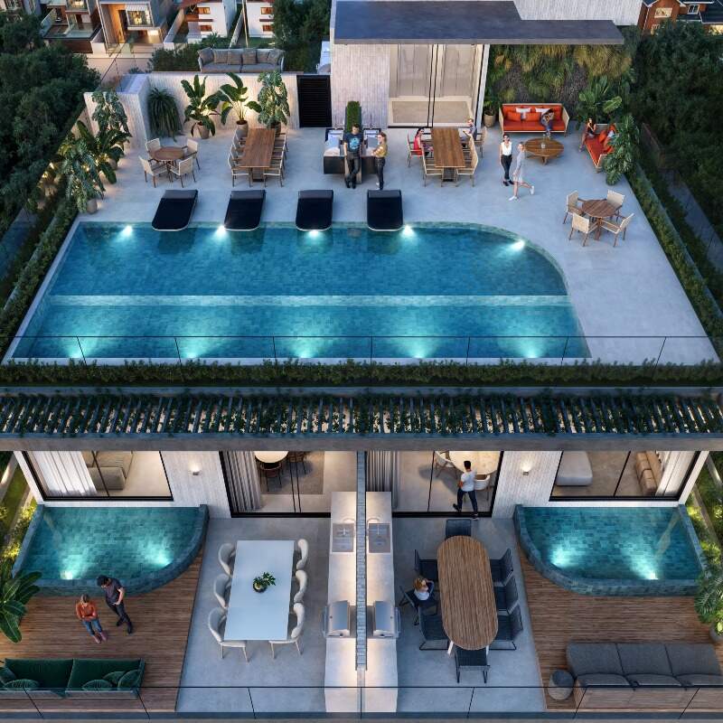 Coberturas com 115m² a 137m² possuindo três quartos sendo um suíte, banheiro social, sala de estar/jantar, cozinha com área de serviço integrada e varanda com área gourmet, churrasqueira e piscina privativa.