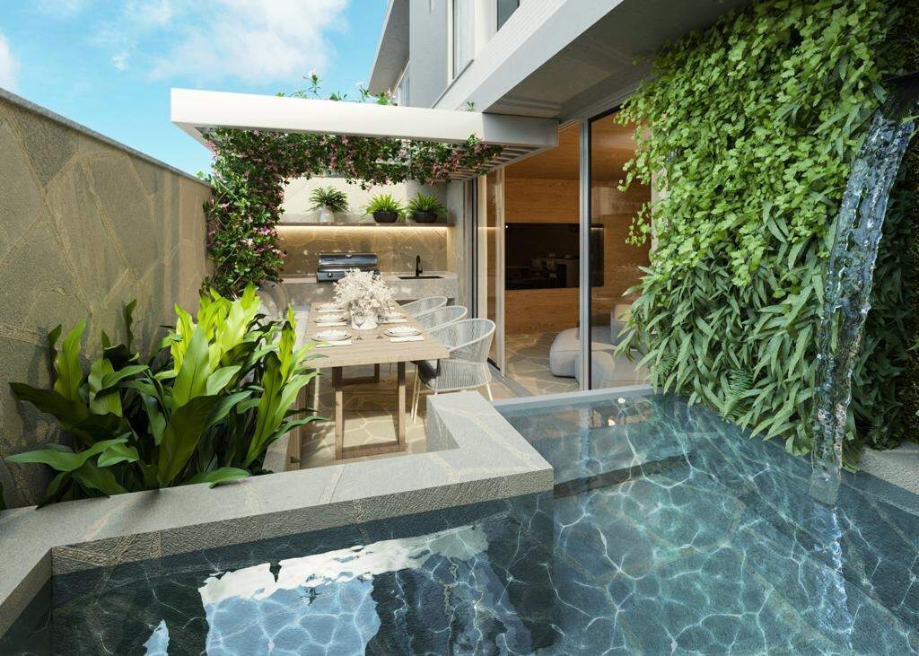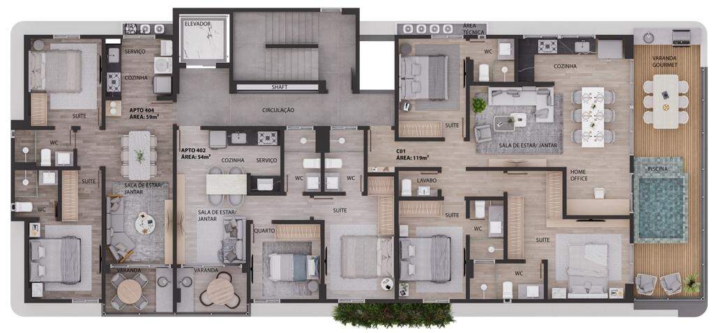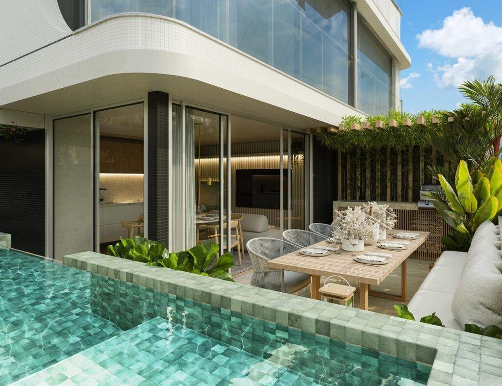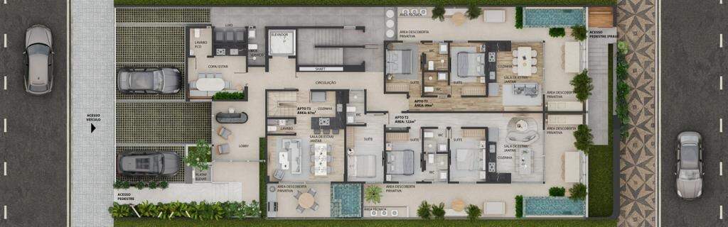 Plantas com 126,30m² possuindo sala ampla para dois ambientes, cozinha, três suítes sendo uma com banheiro reversível e área externa privativa com piscina.