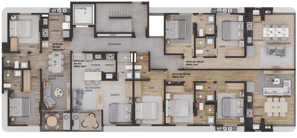 Plantas com 59,40m² possuindo sala ampla para dois ambientes, varanda gourmet, cozinha com área de serviço integrada e duas suítes sendo uma com banheiro reversível.