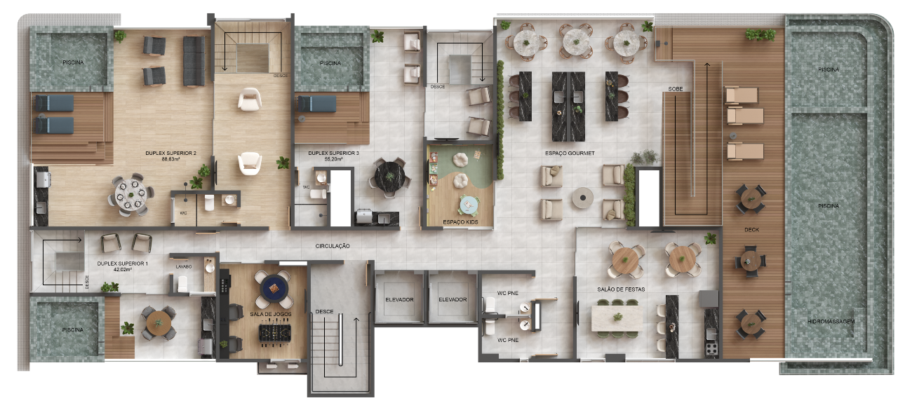 O empreendimento possui uma área de lazer completa para você aproveitar com a família e amigos, com piscina, churrasqueira, espaço gourmet, salão de jogos, academia e muito mais.