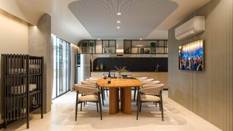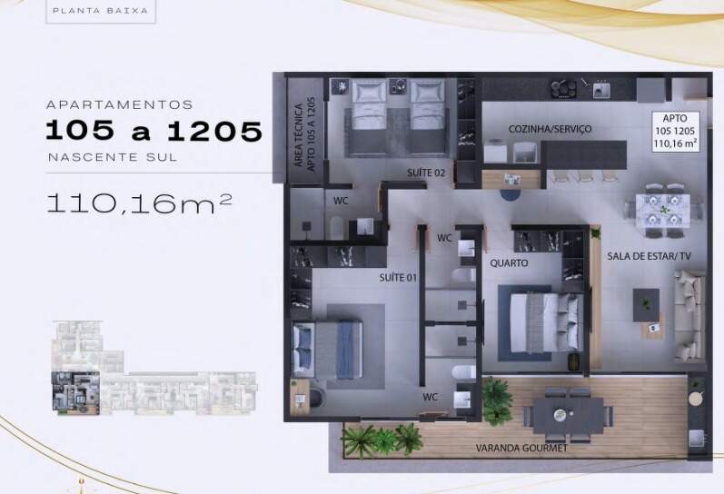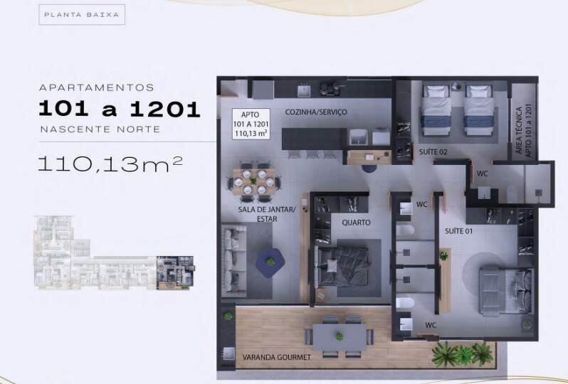 Apartamentos com 110,13m² possuindo três quartos, duas suítes, banheiro social, sala de estar/jantar, cozinha com área de serviço integrada e varanda gourmet.