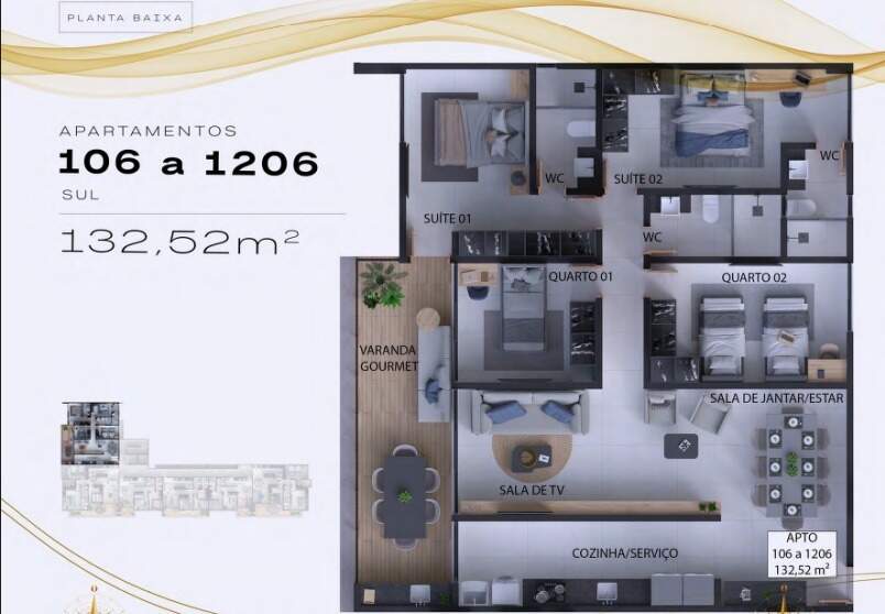 Apartamentos com 132,52m² possuindo quatro quartos, duas suítes, banheiro social, sala de estar/jantar, cozinha com área de serviço integrada e varanda gourmet.