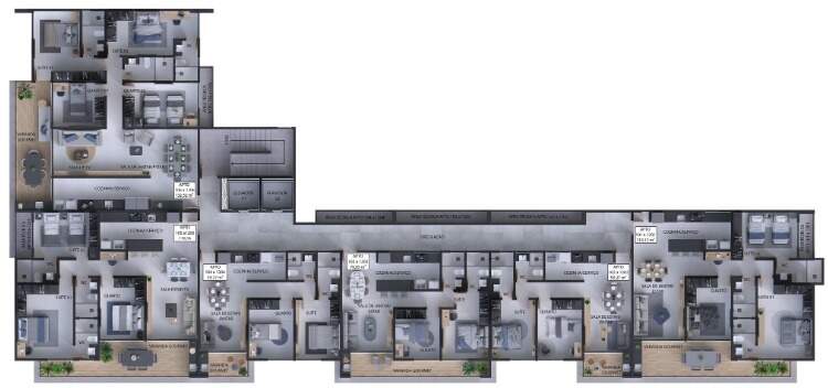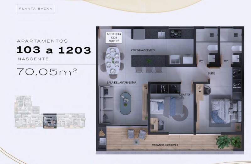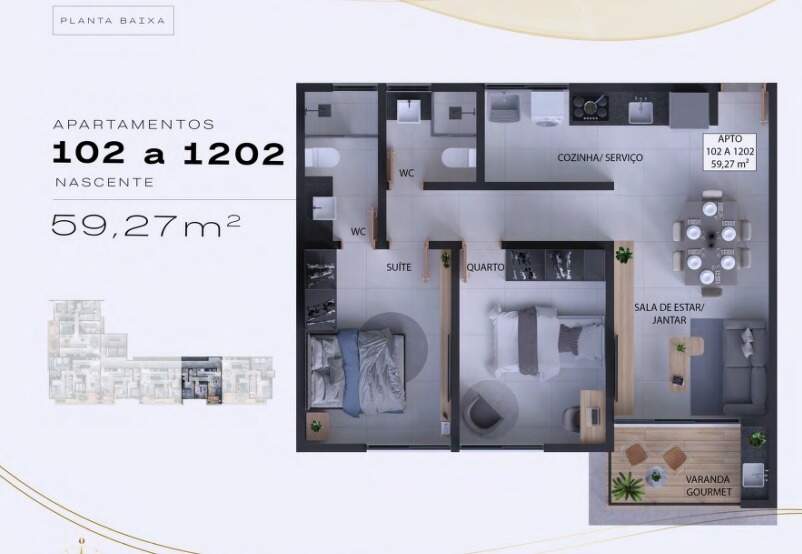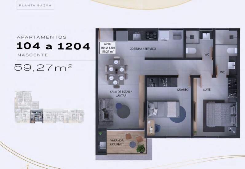 Com opções de plantas diferentes, sendo; Apartamentos com 59,27m² a 70,05m² possuindo dois quartos, uma suíte, banheiro social, sala de estar/jantar, cozinha com área de serviço integrada e varanda gourmet.