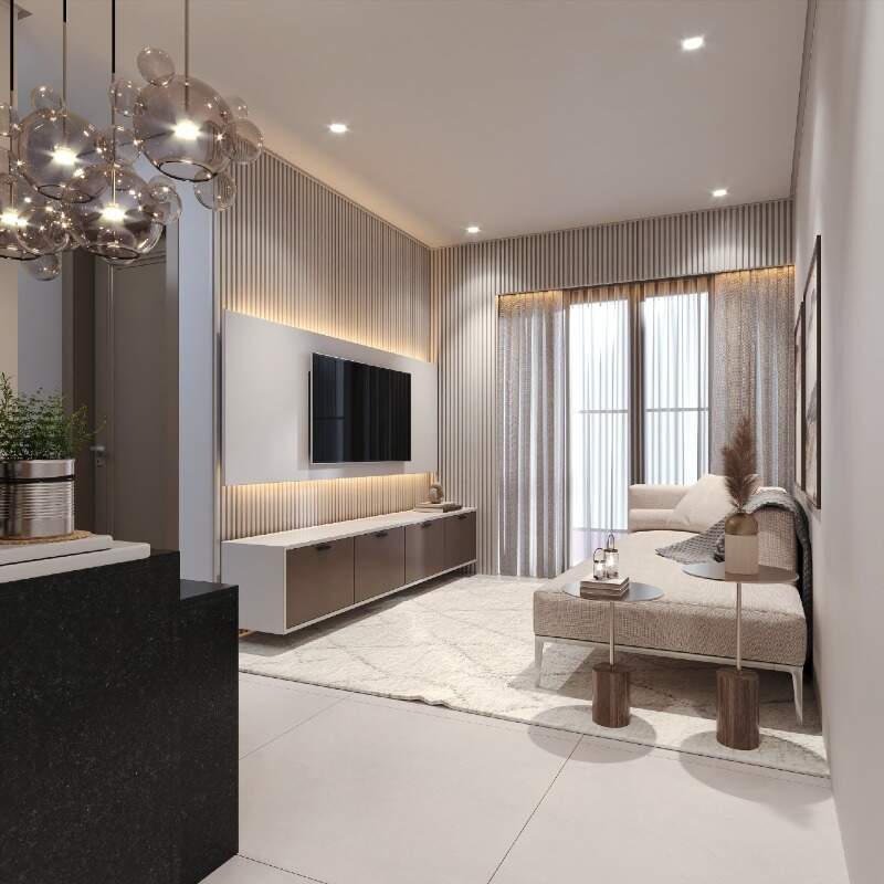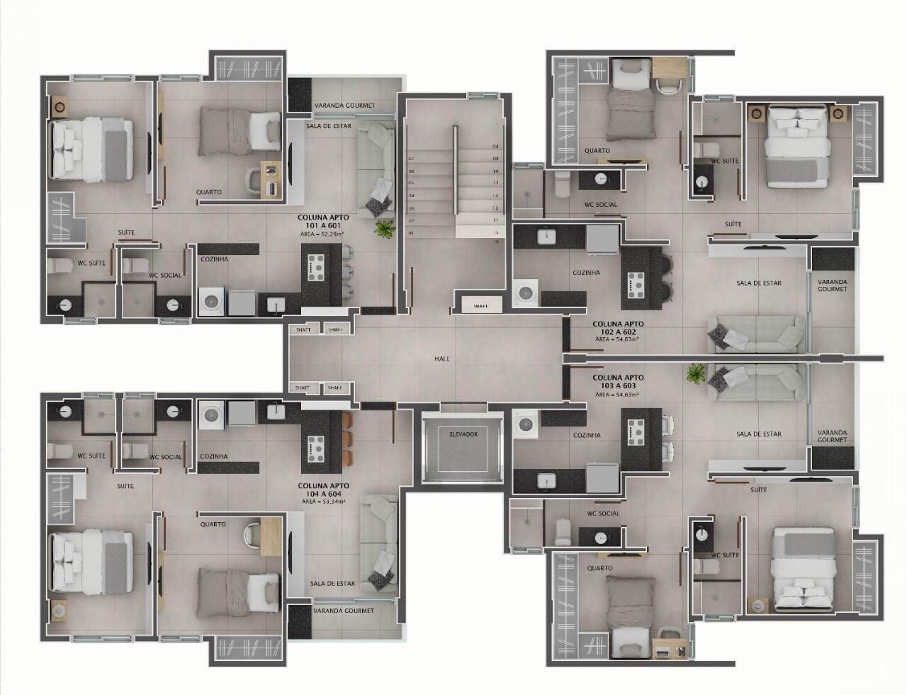 Todas as plantas desse empreendimento tem metragens entre 52,29m² a 54,63m², possui dois quartos, sendo uma suíte, banheiro social, sala de estar, varanda gourmet, cozinha e área de serviço.
