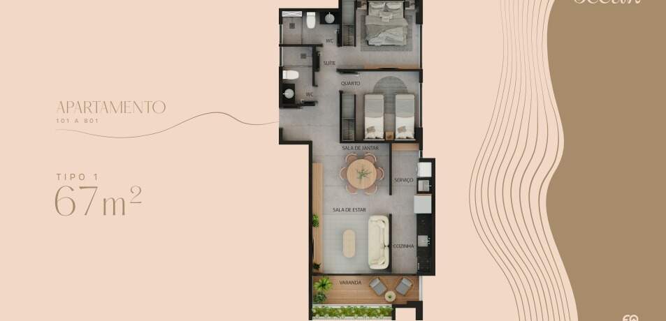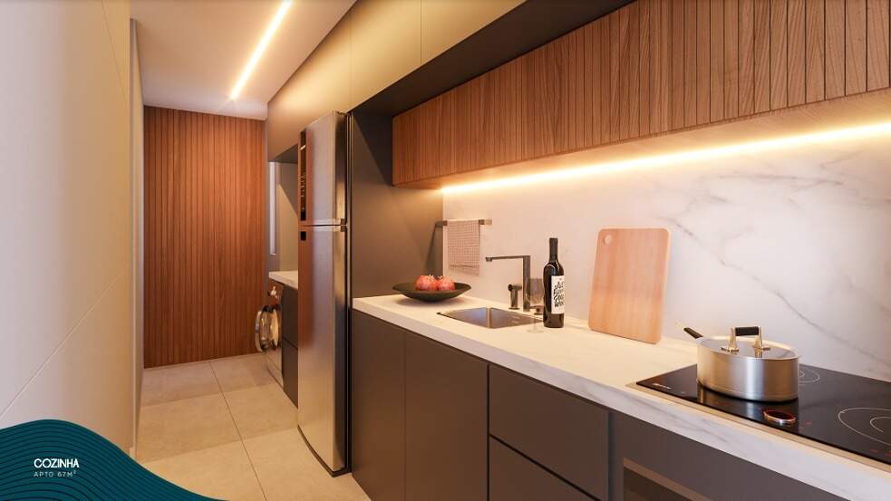Com opções de plantas diferentes, sendo; Apartamentos com 58,40m² a 67,79m² possuindo dois quartos, sendo um suíte, banheiro social, fechadura digital, sala de estar/jantar e cozinha com área de serviço integrada e varanda.