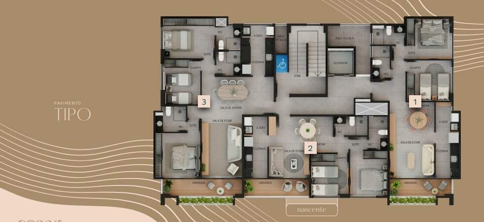 Apartamentos com 92,46m² possuindo três quartos sendo duas suítes, sala de estar/jantar, banheiro social, fechadura digital, cozinha com área de serviço integrada e varanda.