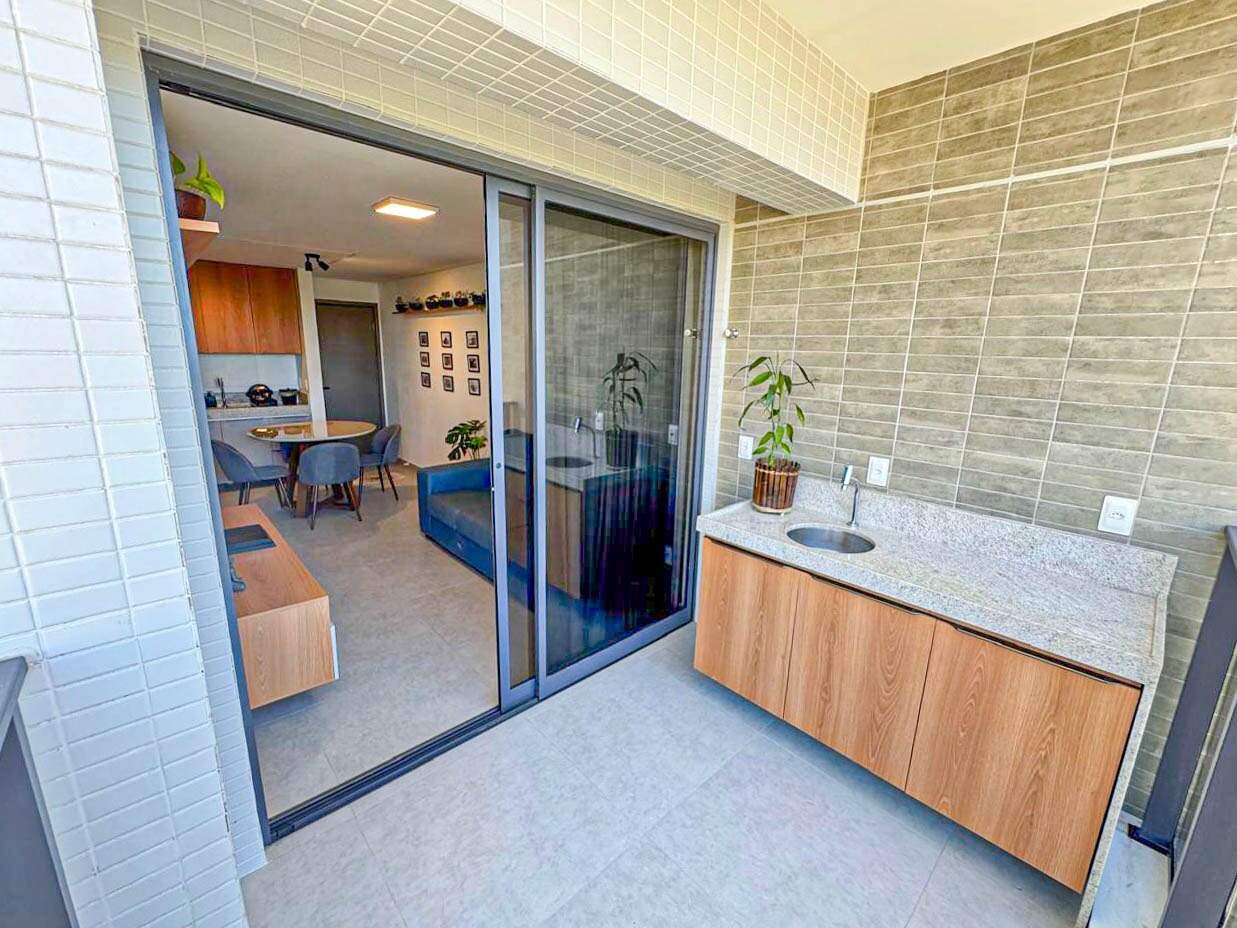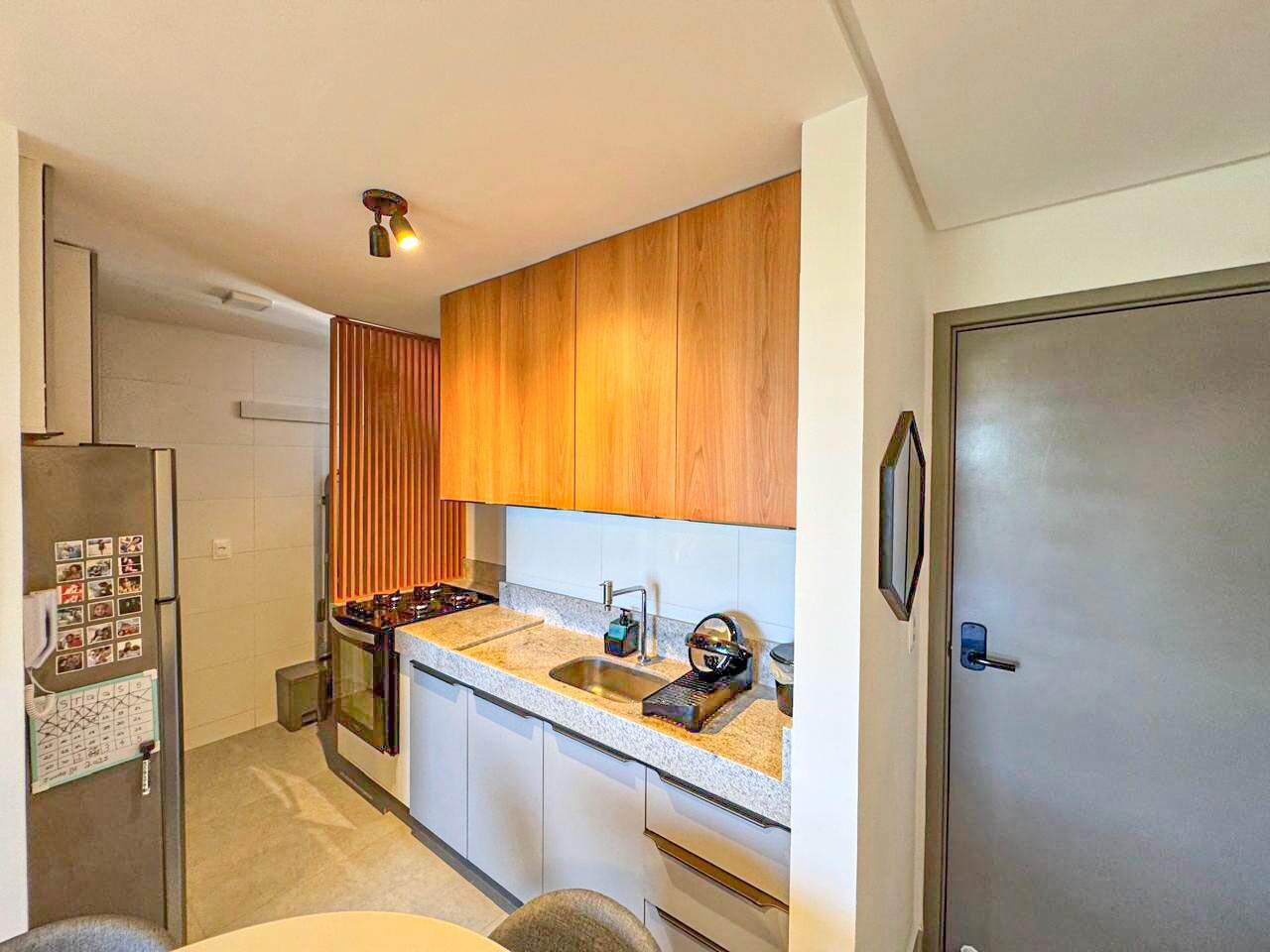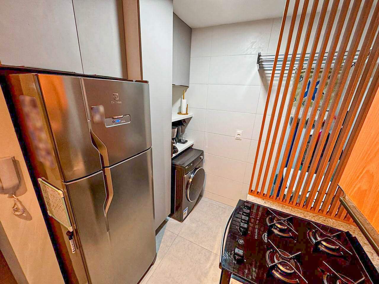 Apartamento com sala ampla para dois ambientes, varanda gourmet, cozinha com móveis projetados e área de serviço integrada, oferecendo praticidade e bom aproveitamento dos espaços. Possui dois quartos, sendo um deles suíte, além de um banheiro social bem distribuído.