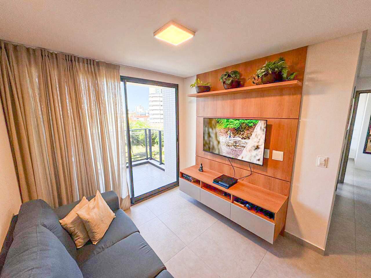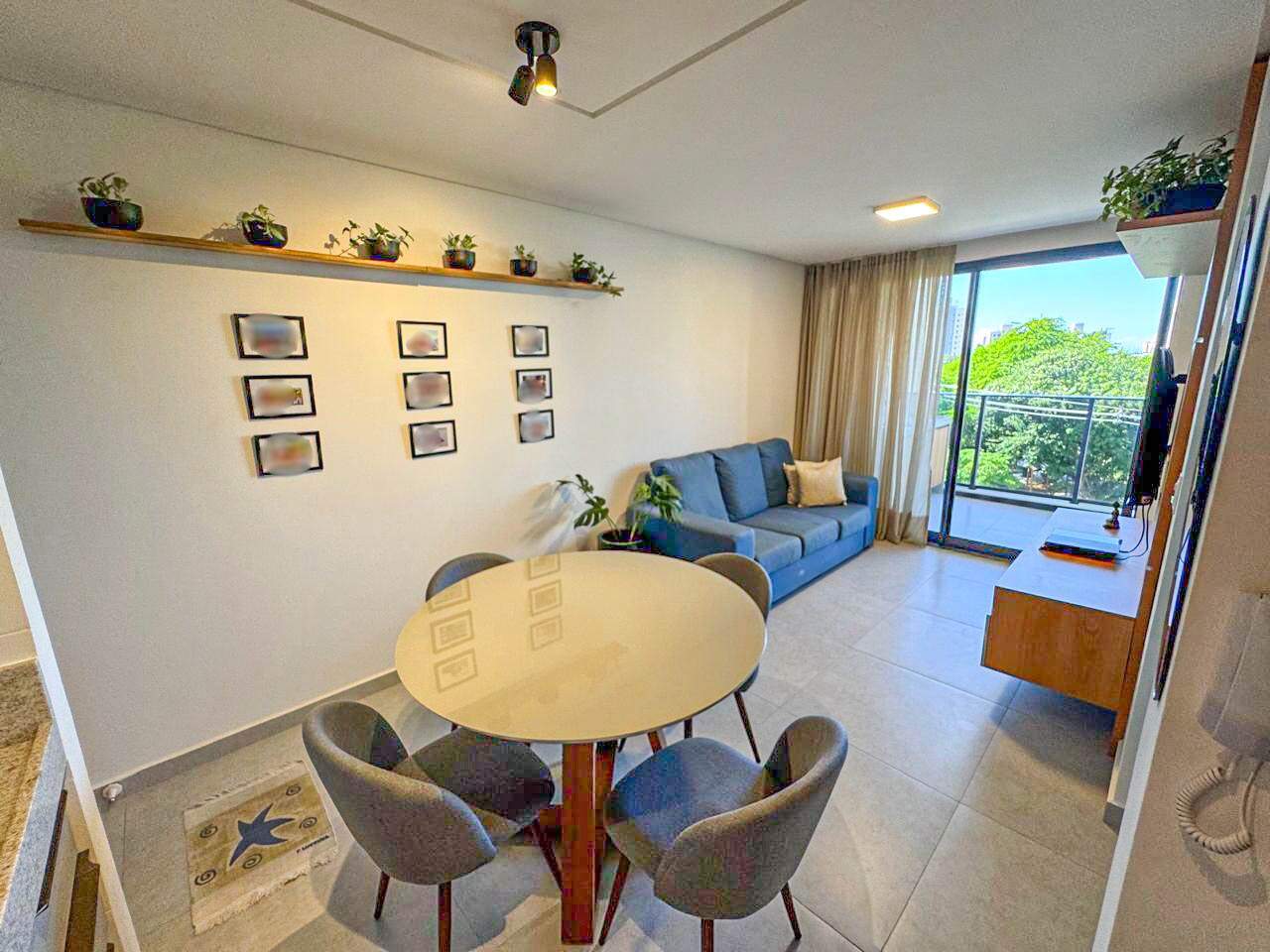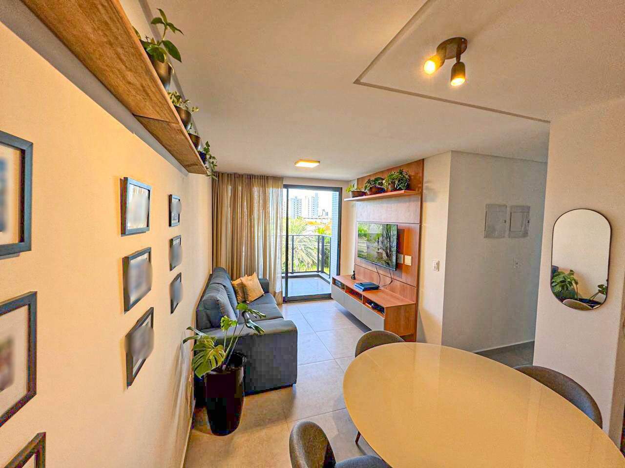 Apartamento com sala ampla para dois ambientes, varanda gourmet, cozinha com móveis projetados e área de serviço integrada, oferecendo praticidade e bom aproveitamento dos espaços. Possui dois quartos, sendo um deles suíte, além de um banheiro social bem distribuído.
