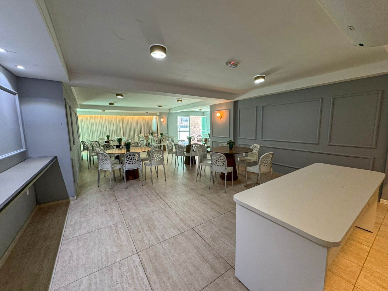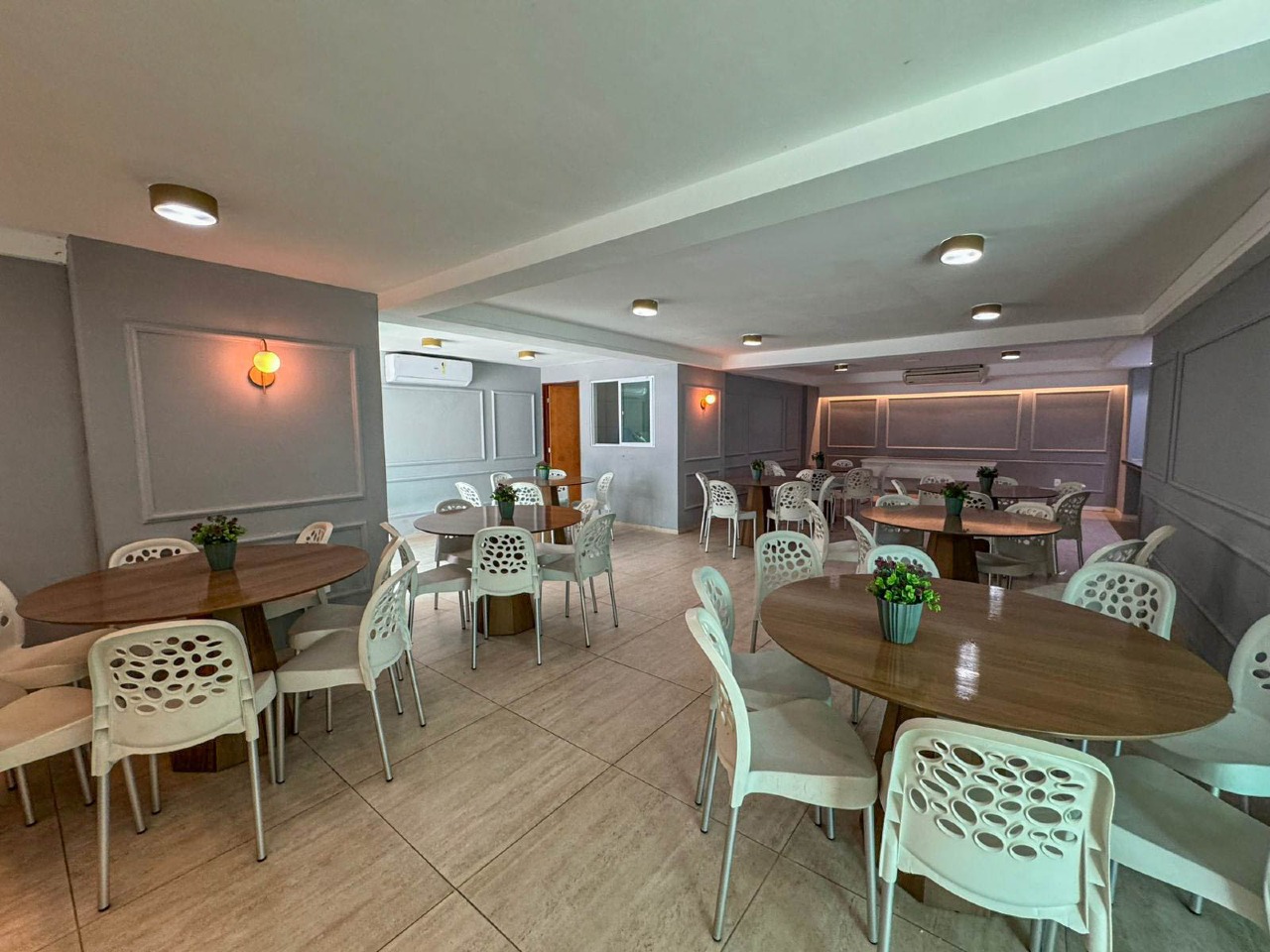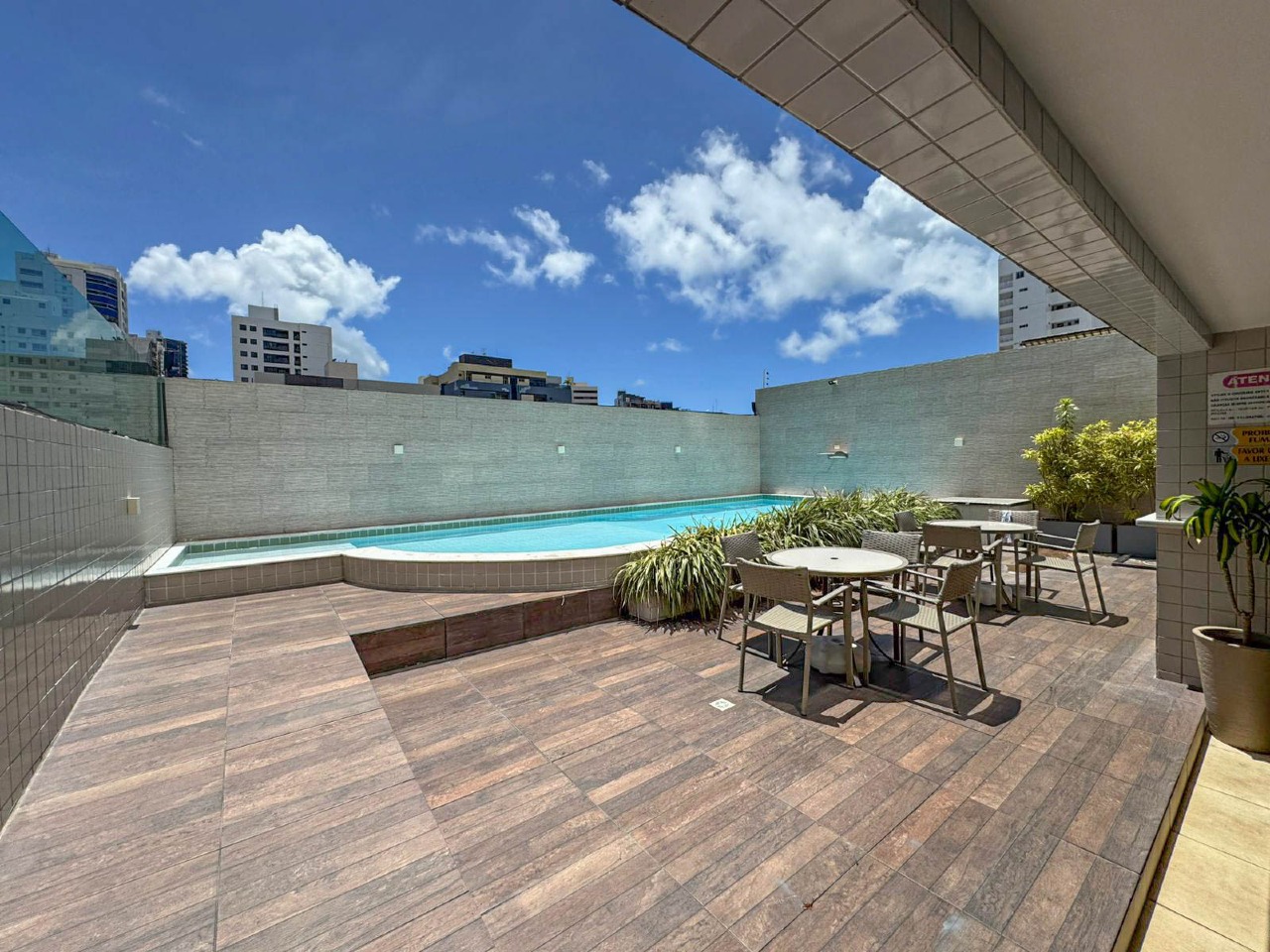 > Área externa com salão de festas e piscina;