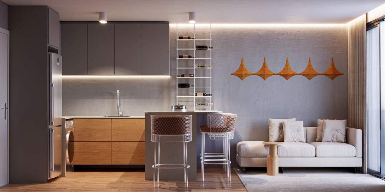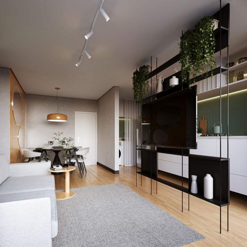 Planta com 52m² possuindo sala de estar/jantar, banheiro social, cozinha com área de serviço integrada, uma suíte e um home office que pode ser utilizado como quarto.