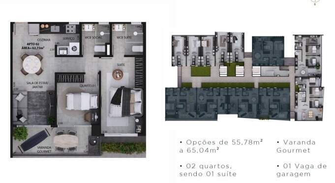 Com opções de plantas diferentes, sendo; Apartamentos com 55,78m² a 63,86m² possuindo dois quartos, uma suíte, banheiro social, sala de estar/jantar e cozinha com área de serviço integrada e varanda.