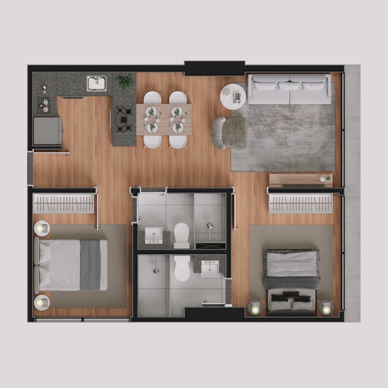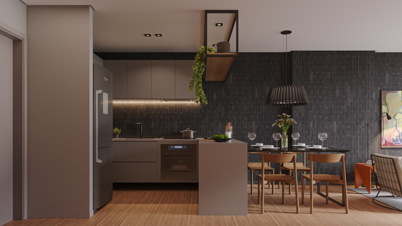 Apartamentos com 50,00m² possuindo dois quartos, sendo um suíte, banheiro social, sala de estar/jantar e cozinha com área de serviço integrada.