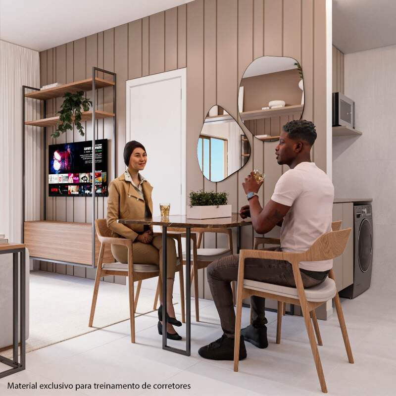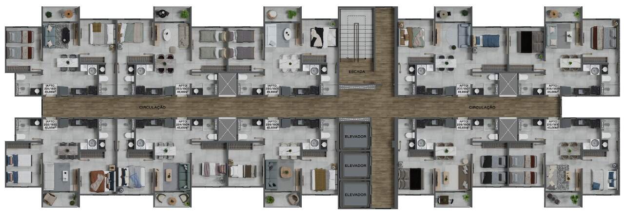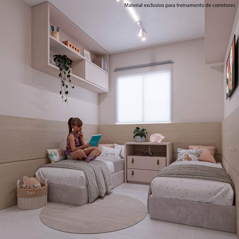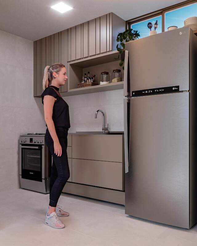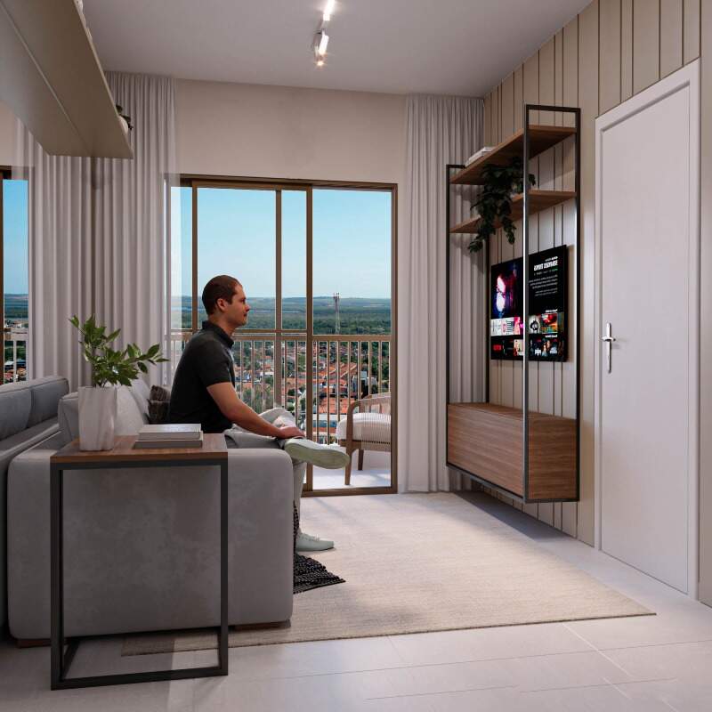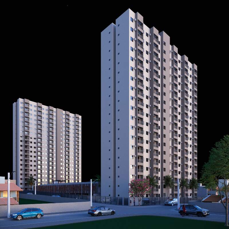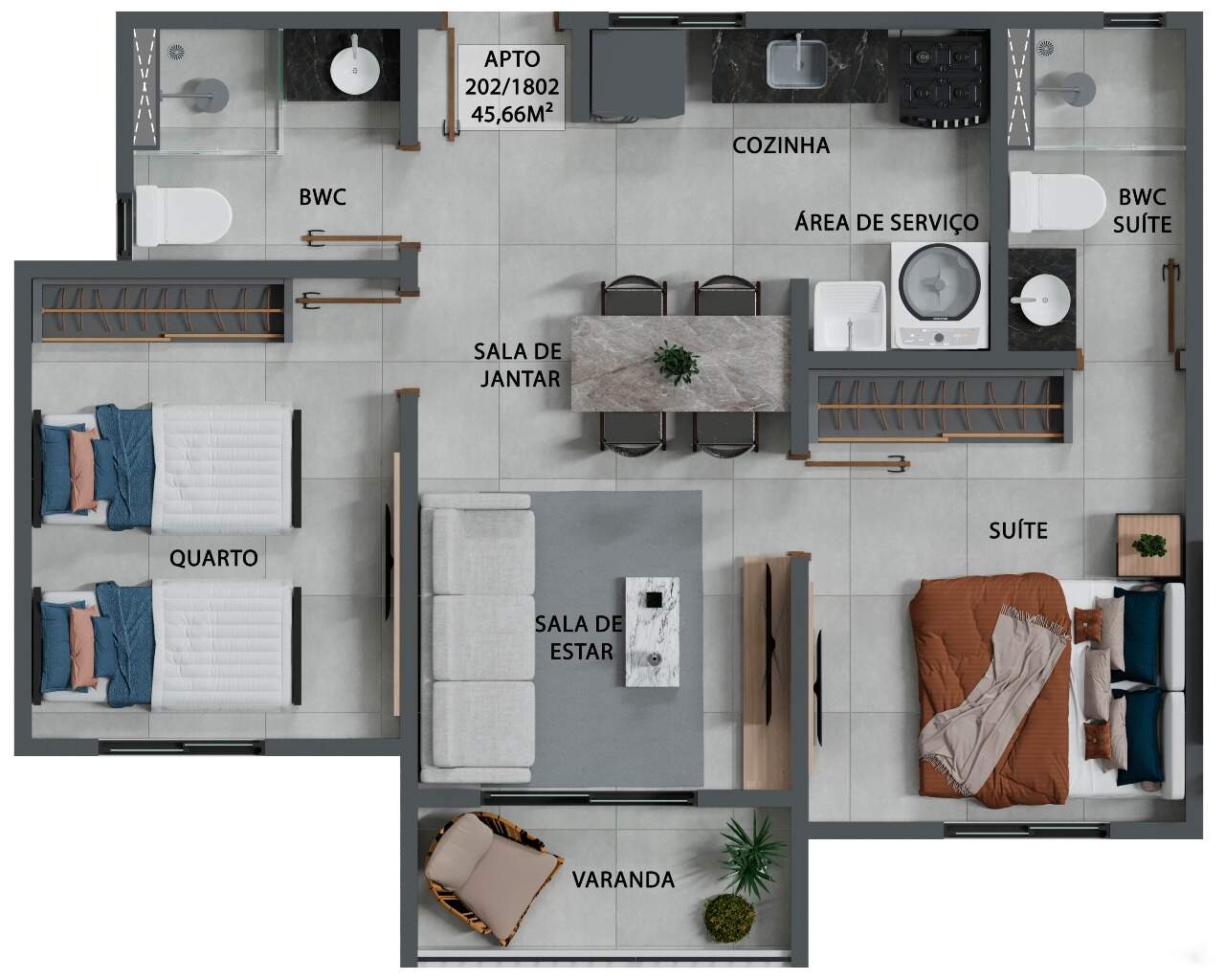 Apartamentos com 45,66m² possuindo dois quartos, sendo um suíte, banheiro social, sala de estar/jantar e cozinha com área de serviço integrada.