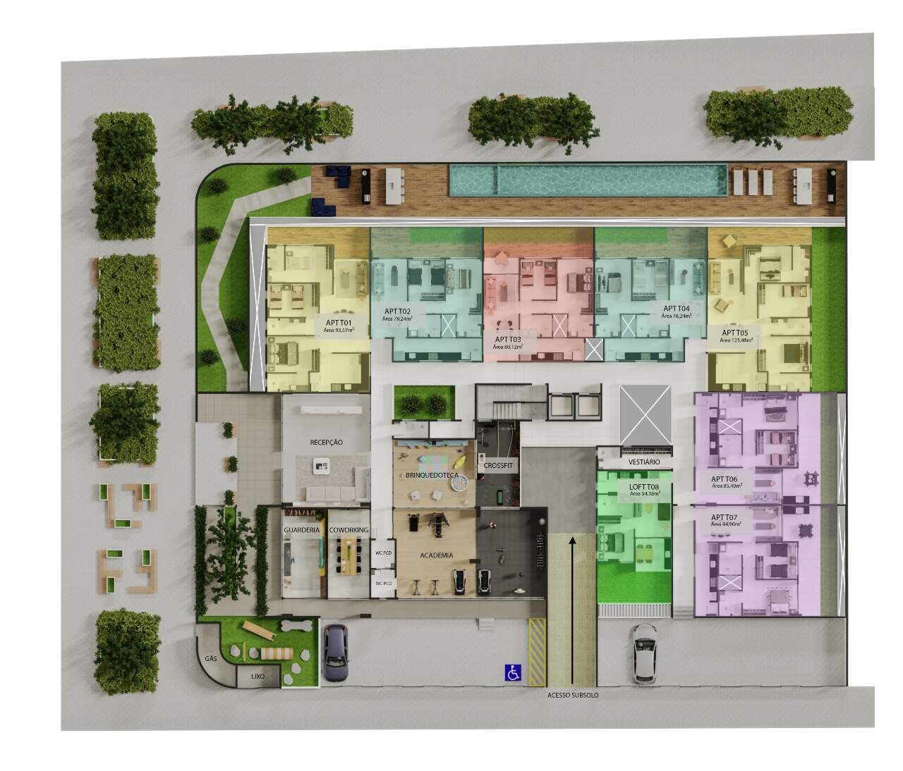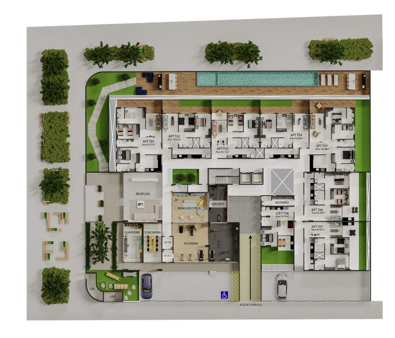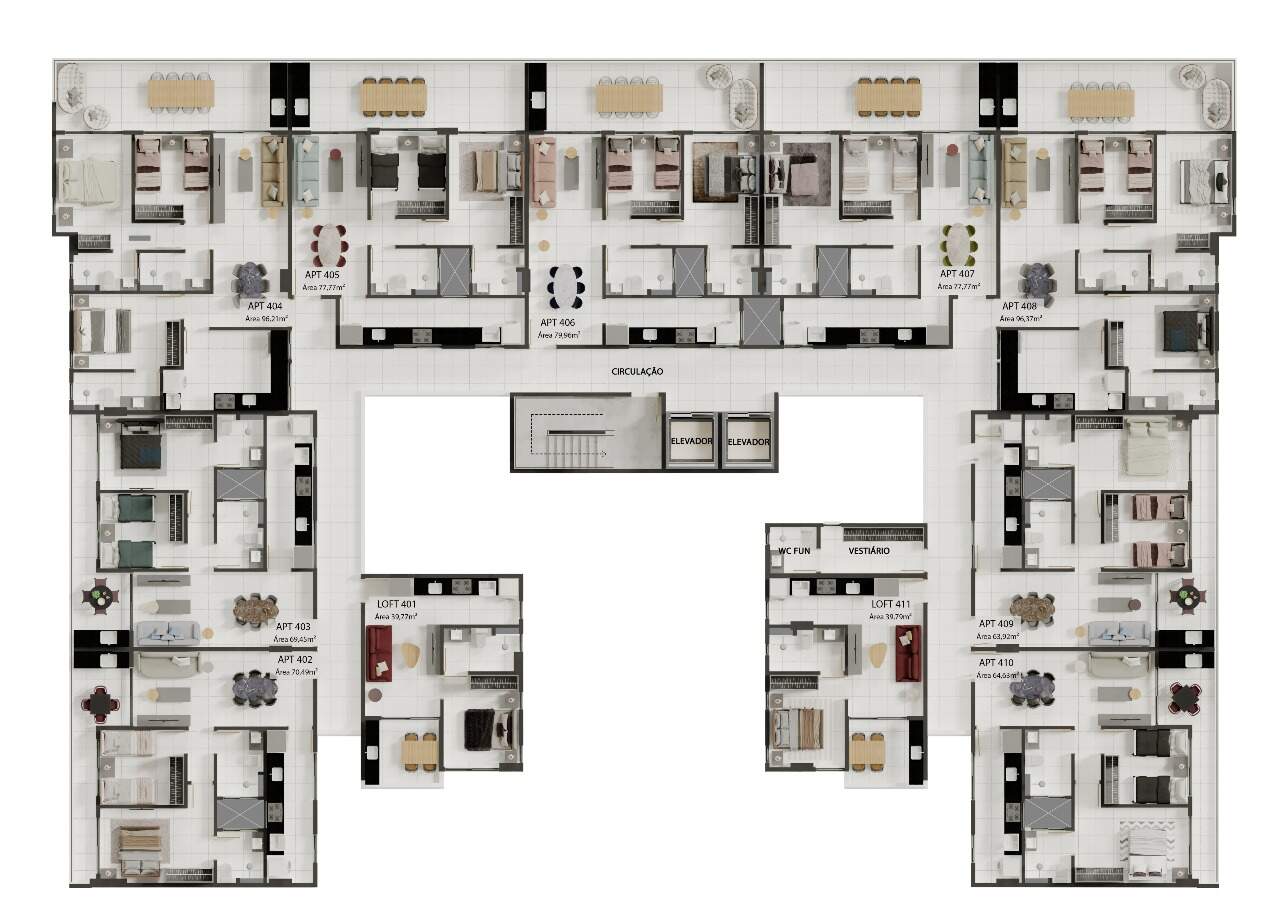 Apartamentos com opções de plantas entre 39m² a 97m², com 1, 2 ou 3 quartos, com 1 ou 2 suítes, com sala, cozinha, varanda gourmet e vagas de garagem sendo rotativas ou até 2 vagas privativas. Além disso, o prédio possui tudo o que você precisa para viver com mais conforto e praticidade com coworking, brinquedoteca, academia, piscina, espaço gourmet, elevador e muito mais!
