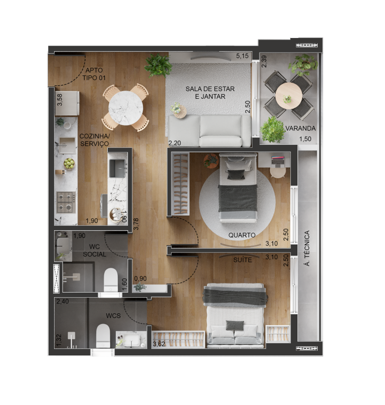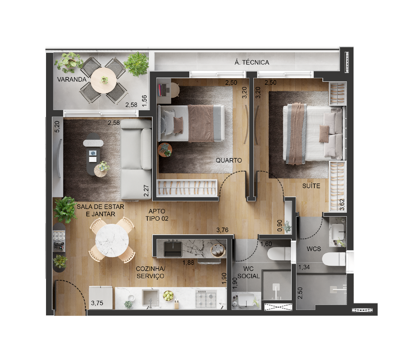Plantas com 57,66m² possuindo; Sala ampla para dois ambientes, varanda, dois quartos sendo um suíte, banheiro social, cozinha com área de serviço integrada.
