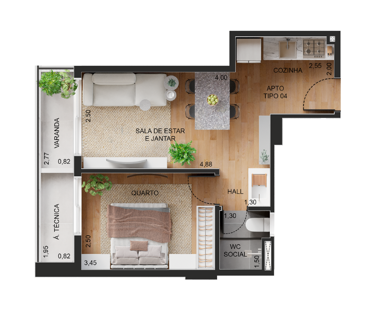 Plantas de 38,23m² possuindo; Sala ampla para dois ambientes, varanda, banheiro social, 1 suíte e cozinha.