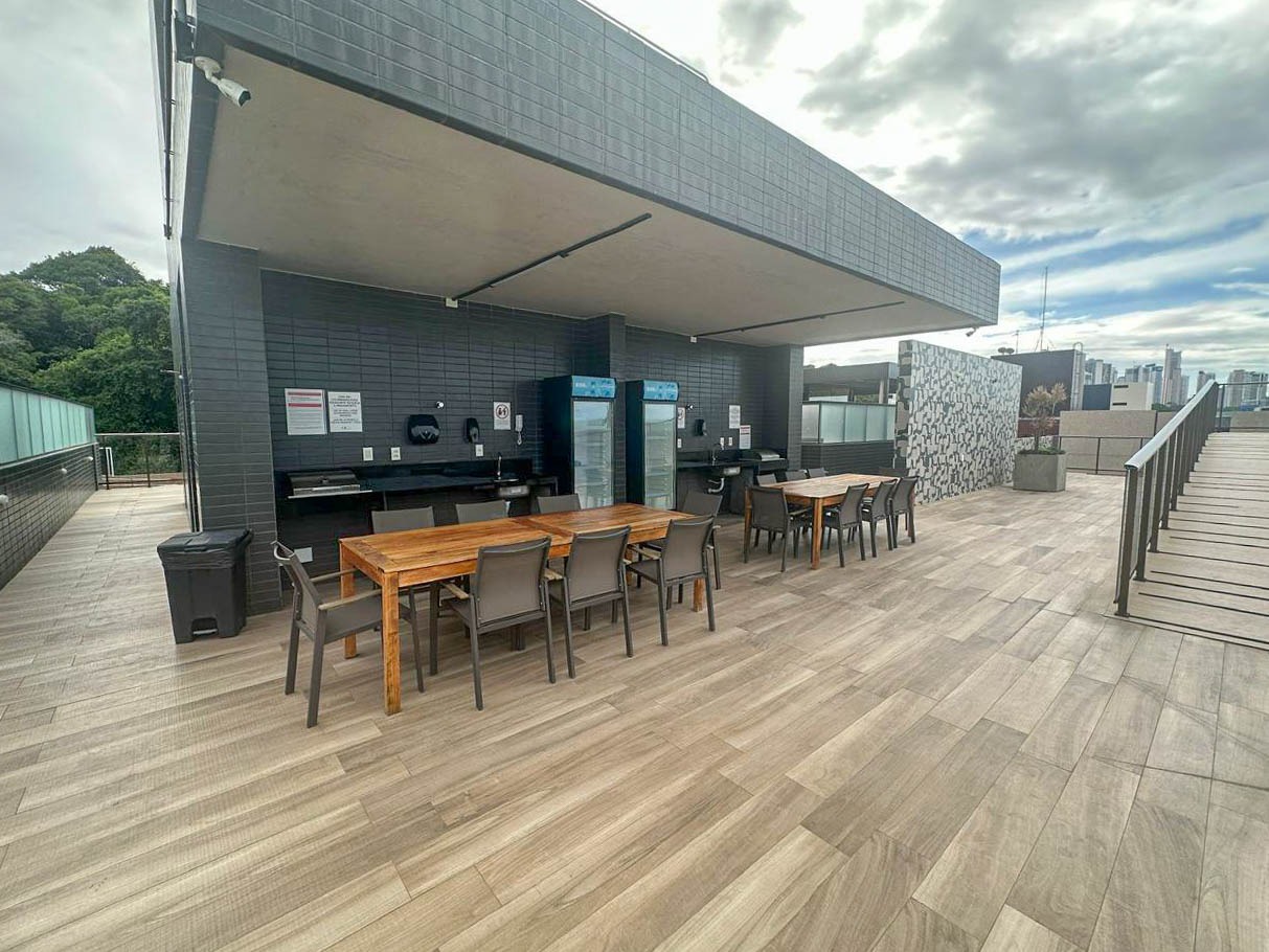 > Área de lazer com piscina e espaço gourmet;