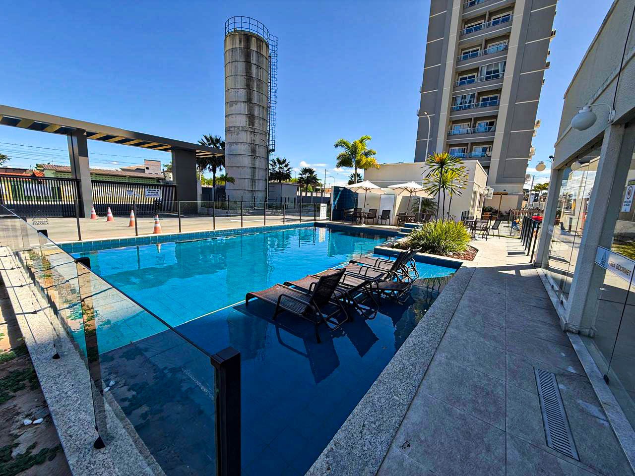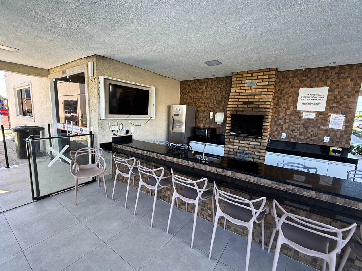 > Área de lazer com piscina, churrasqueira e espaço gourmet;